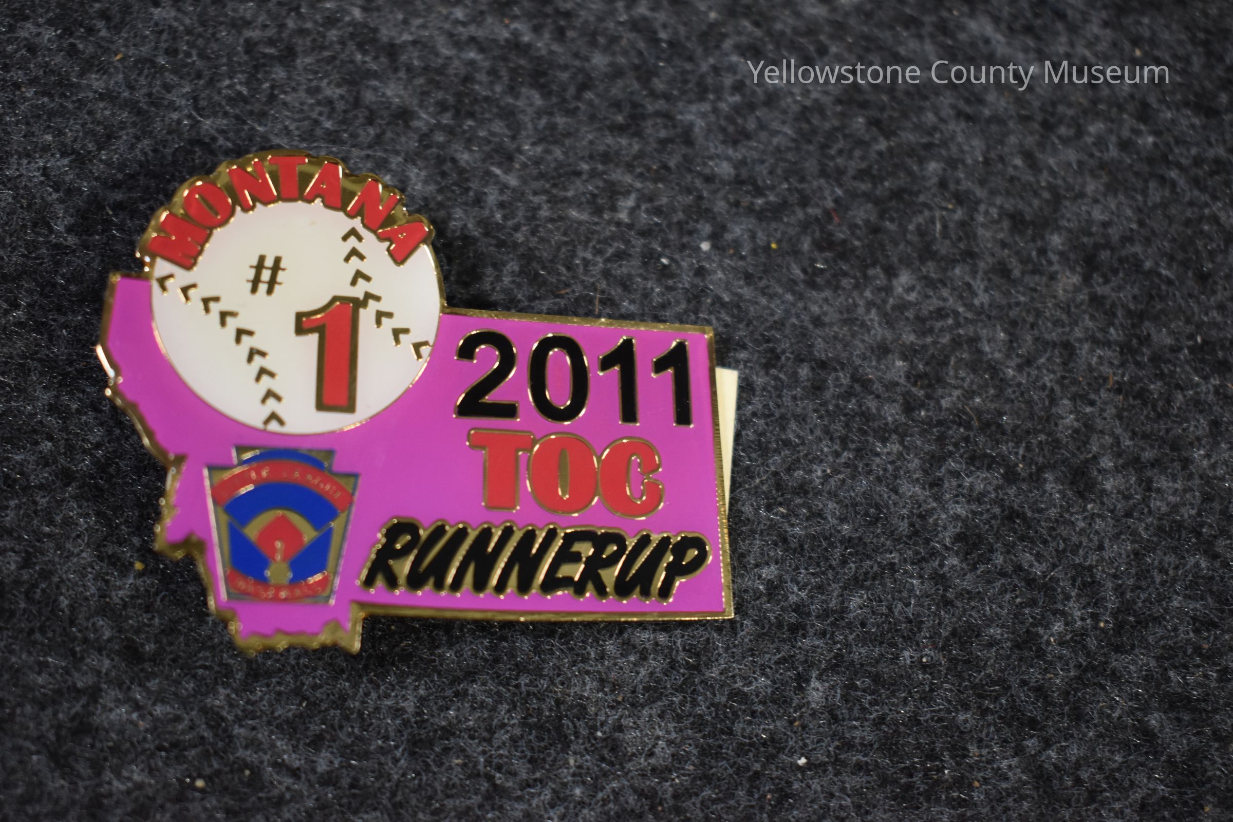 A pink montana shaped pin with a baseball in the upper lefthand corner. The baseball says "Montana 1," and the state portion says "2011 TOC Runnerup." In the lower lefthand corner is the Little League Baseball logo.Acquisition