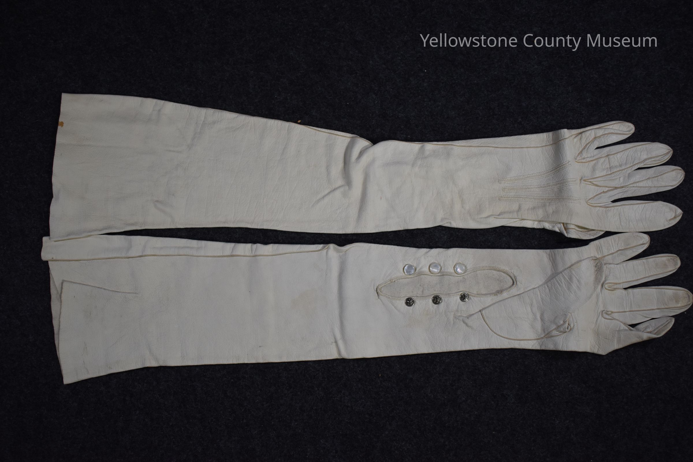 Long White Gloves (pair), mother of pearl buttons; Stamp inside R glove reads: Mrs. J.E. Perry, 2936 Upper Highwood Drive, Billings, MT, and both gloves have hand-written "8140-3-" inside glove.Acquisition