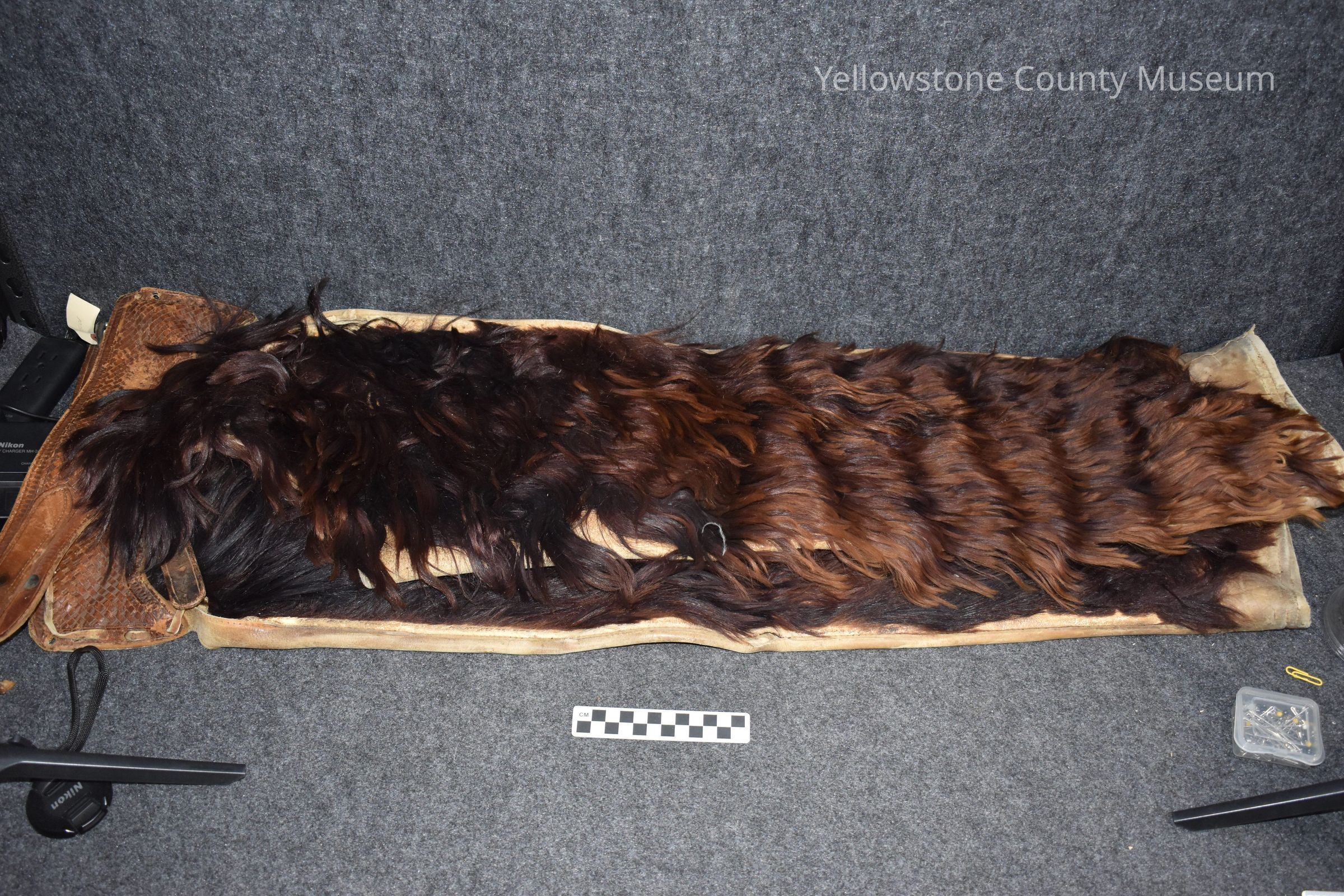 A pair of leather chaps; the front of the chaps are covered in brown hair; the belt has a metal clasp, and the leather component of the belt is brokenAcquisition