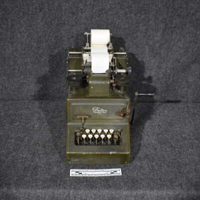 This Dalton ten-key manual adding machine is from the late 1920’s or later since the glass sides are not present. There are two rows of white plastic number keys marked with digits in the sequence: [2 4 5 7 9] on top and [1 3 0 6 8] below. The black keys are function keys labeled: multiply, backspace, correction, release, subtotal, and total. Located on the right hand side is a hand crank. The machine is designed to print out nine-digit totals on a paper roll inserted into a paper tape dispenser and feed through a movable nine-inch carriage located just in front.