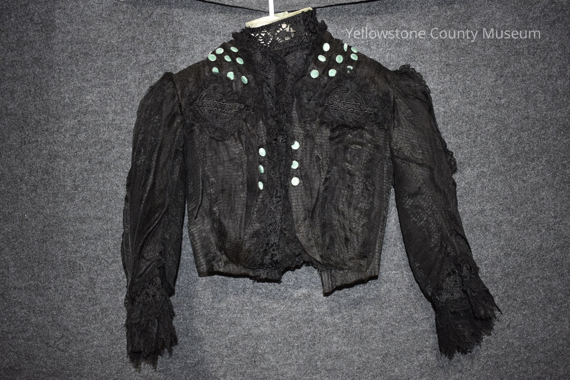 Woman's black lace Wedding Suit; blouse of dotted swiss & lace, turquois buttons; skirt black velvet lining, weightedAcquisition