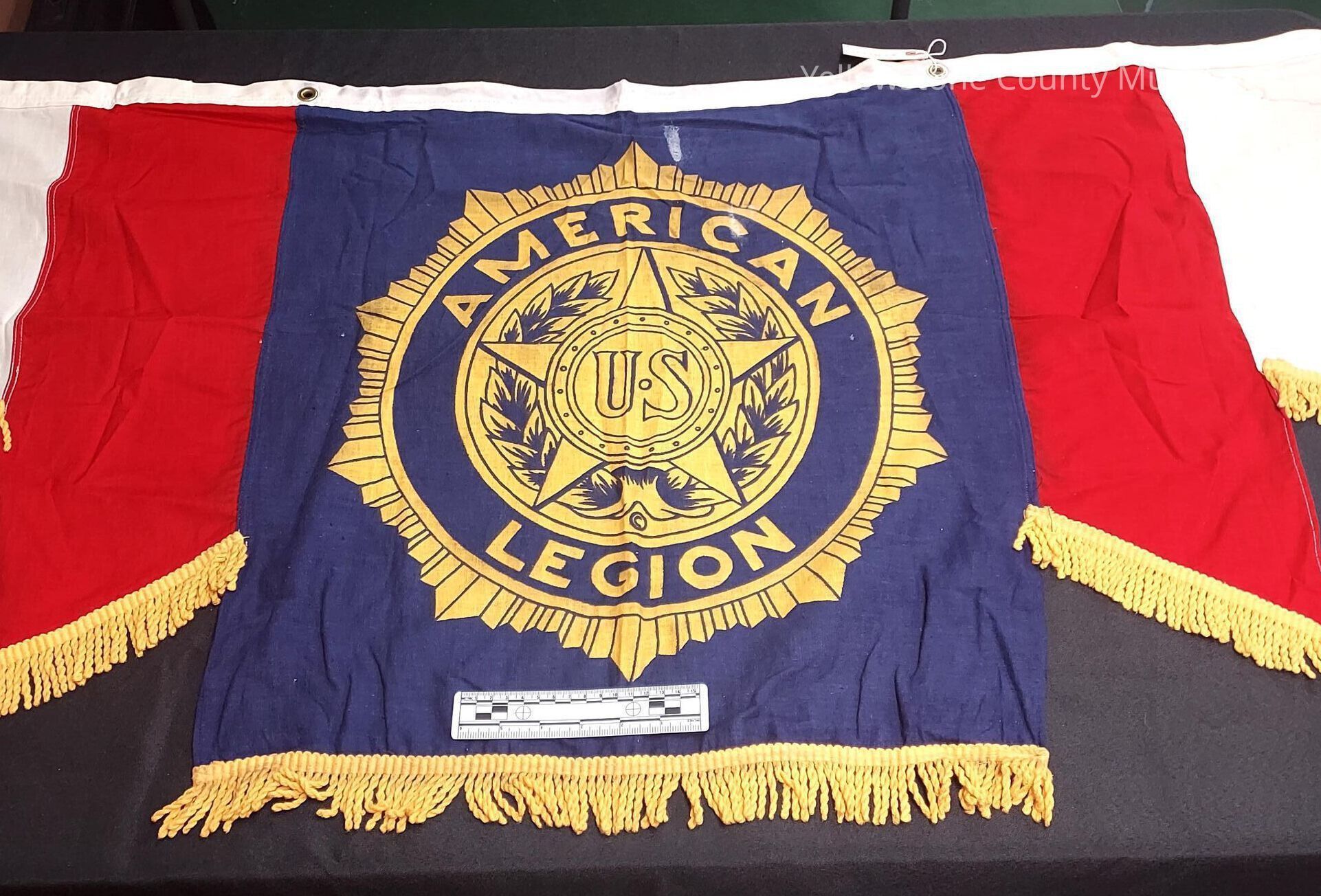 American Legion banner; Center blue panel with gold lettering, star, leaf and US in a central design; Two 7" wide red panels with a diagonal bottom edge are on each side of the blue and 2 white shorter panels are on the outer edges. Gold fringe is on the bottom of panels. Top white edge has 4 grommets for hanging. 2 ft x 85"