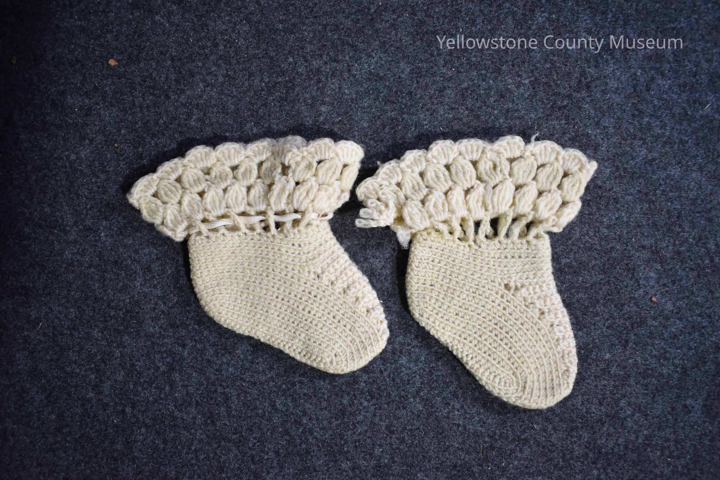 D and E. Baby Bootees, 1910 (Pair) light yellow croqueted bootees, with a ribbon around the ankle.
