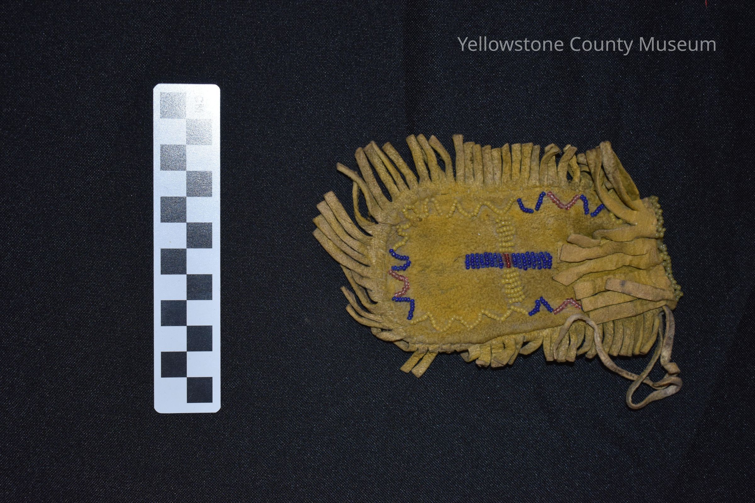 U-shaped, fringed pouch of leather, blue & clear pink beads on side, yellow beads around top