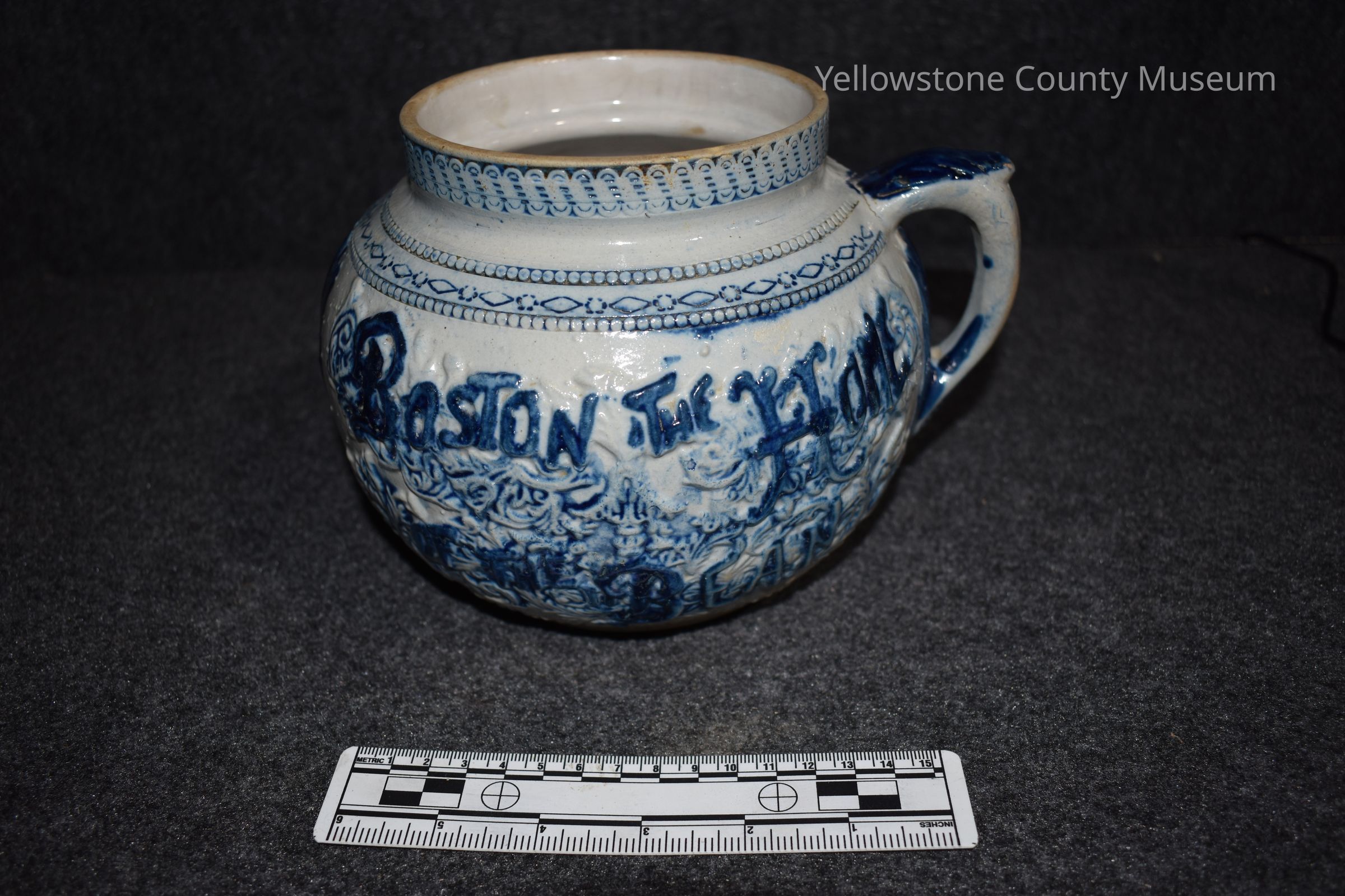 Description states: "Early Day Bean Pot; Bean Pot brought from Boston by early day settlers. Donated by W. H. Dunne". Blue and white design with writing on both sides; on one side it says Boston The Home of The Bean, the second says Spirit of 76 Bunker Hill.Acquisition