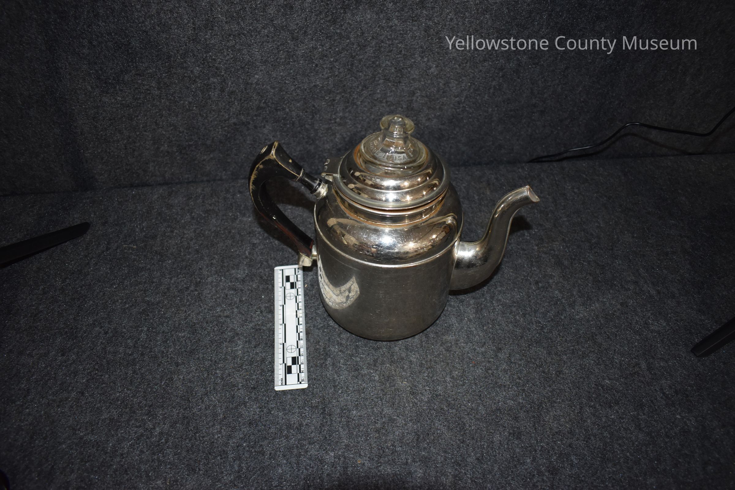 Pyrex 9-cup Percolator; stovetop, made in USA written on glass knob, includes stem and basket inside, for a total of 4 pieces. Old, from donor's homestead near Lavina, MT.Acquisition
