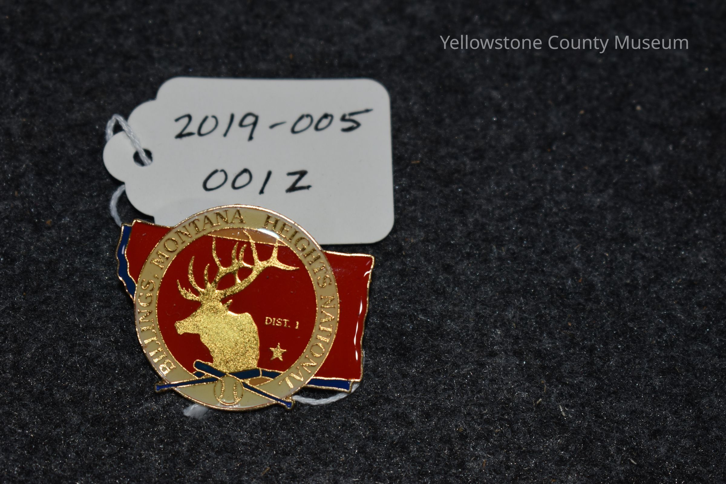 A pin that is shaped like the state of Montana with a round seal over the top of it. The Montana portion is red and blue. In the middle seal of the is a golden elk with blue bats underneath it and a baseball below the bats.Acquisition