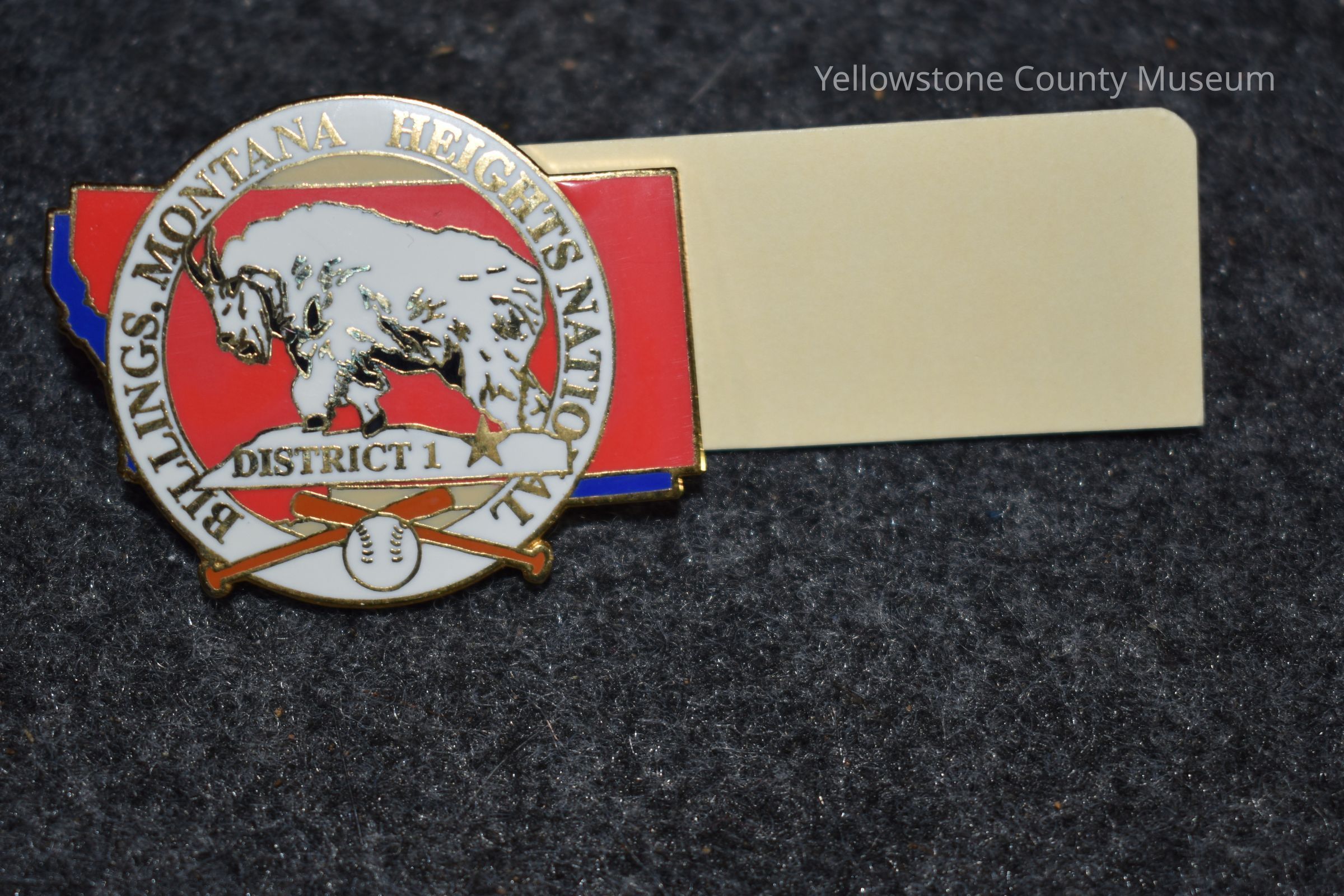 A pin shaped like the state of Montana, with a round seal over the top. The "state" is red and blue, the seal is white with a white mountain goat in the middle. In gold lettering reads: "Billings, Montana Heights National District 1." Under the goat is crossed baseball bats with a baseball beneath it.Acquisition