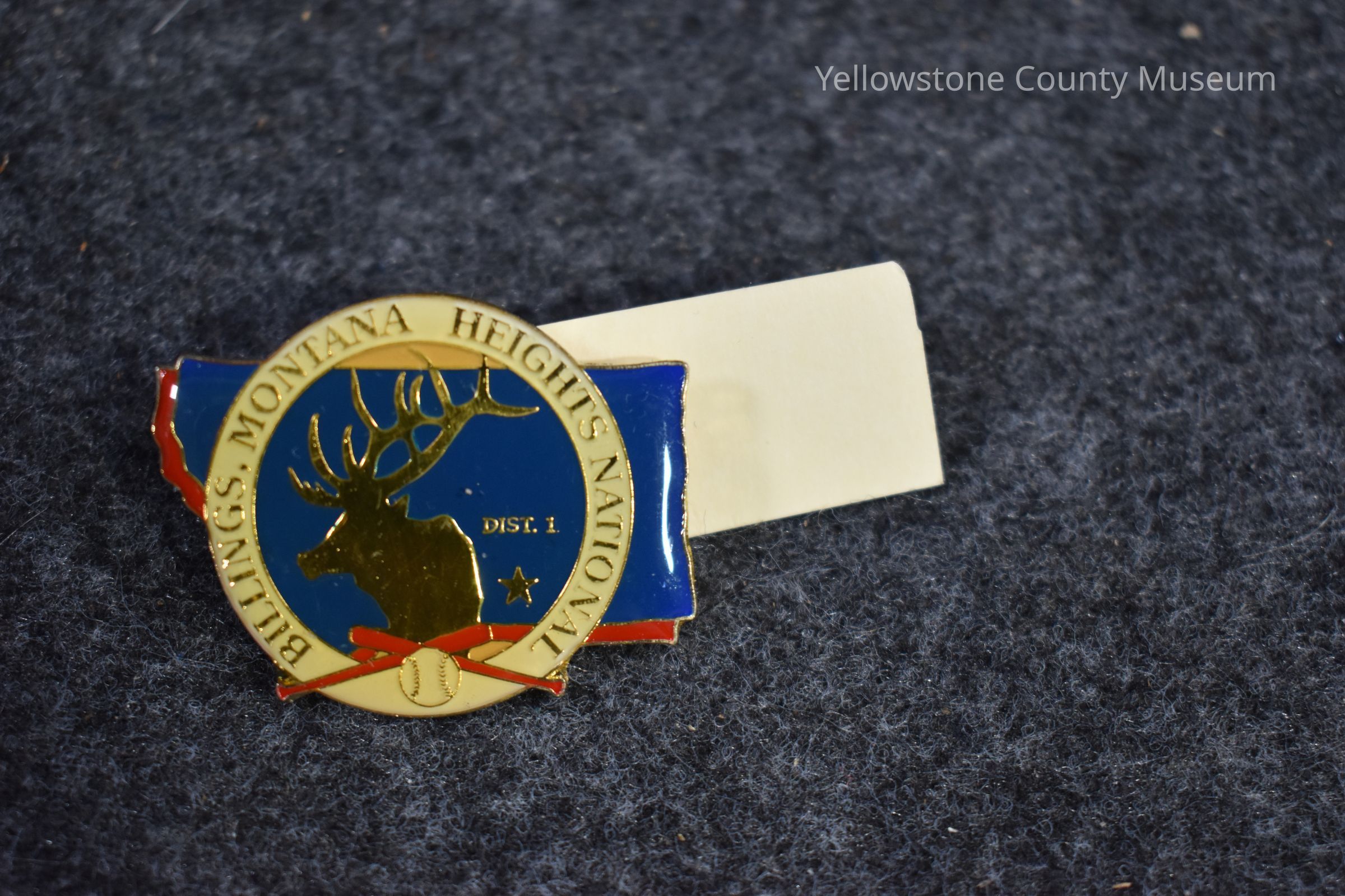 A pin shaped like the state of Montana with a seal over the top. The montana shaped portions are blue and red. In the middle of the seal is a golden elk. The seal border reads "Billings, Montana Heights National". There are two red crossed bats with a baseball beneath it.Acquisition