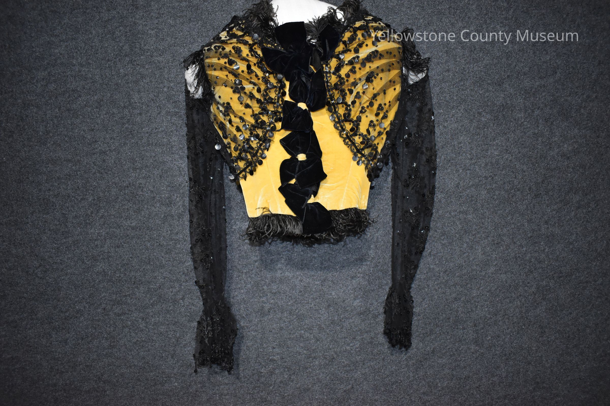 Blouse & Skirt; Parisian Suit Company, Chicago. Gold & black feathers. Also has separate piece of yellow velvet with black lace overlay about 7x13"