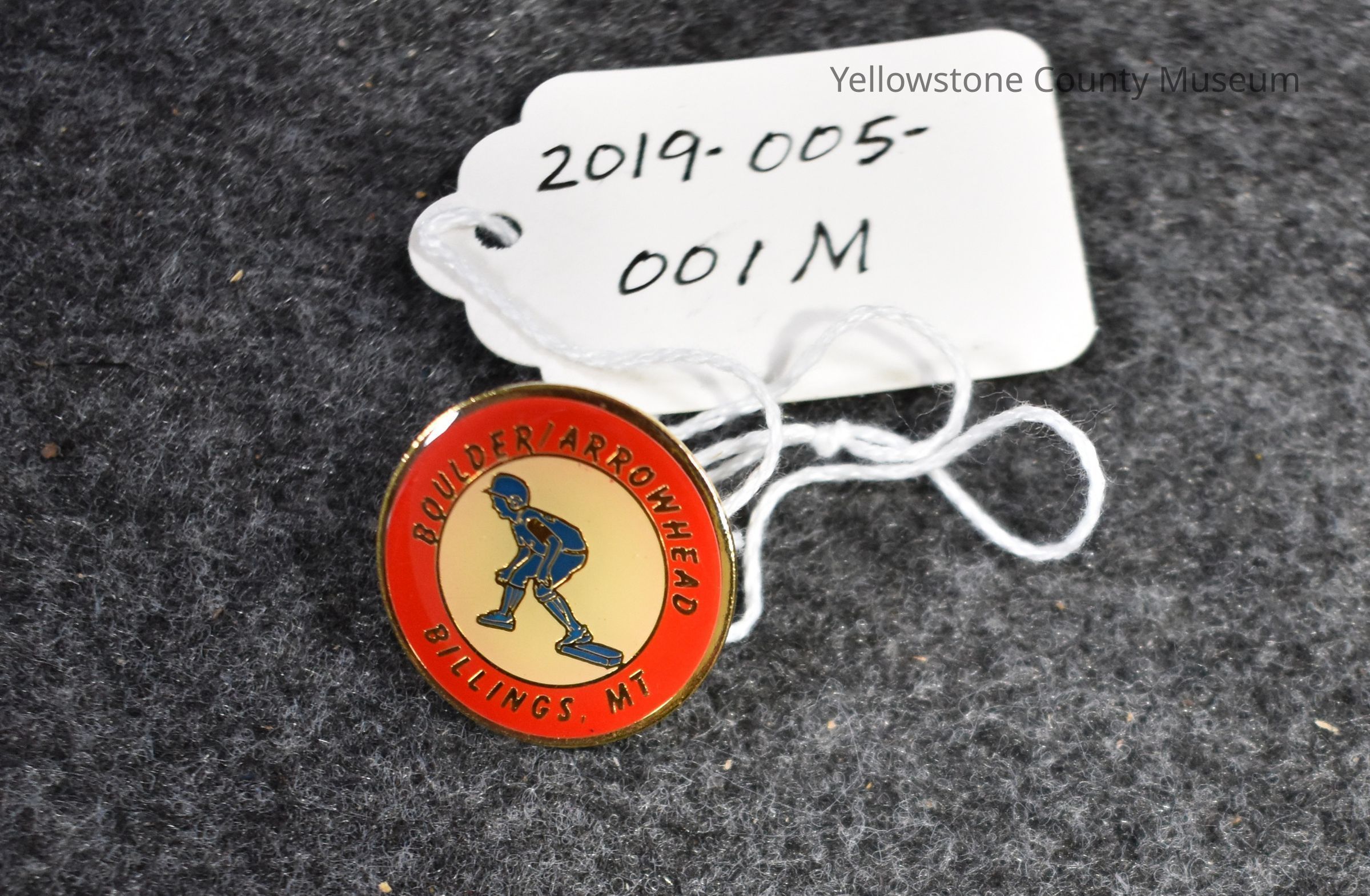 A round pin with a red border and a representation of a baseball player touching a base. In gold lettering the pin reads: "Boulder/Arrowhead Billings, MT."Acquisition