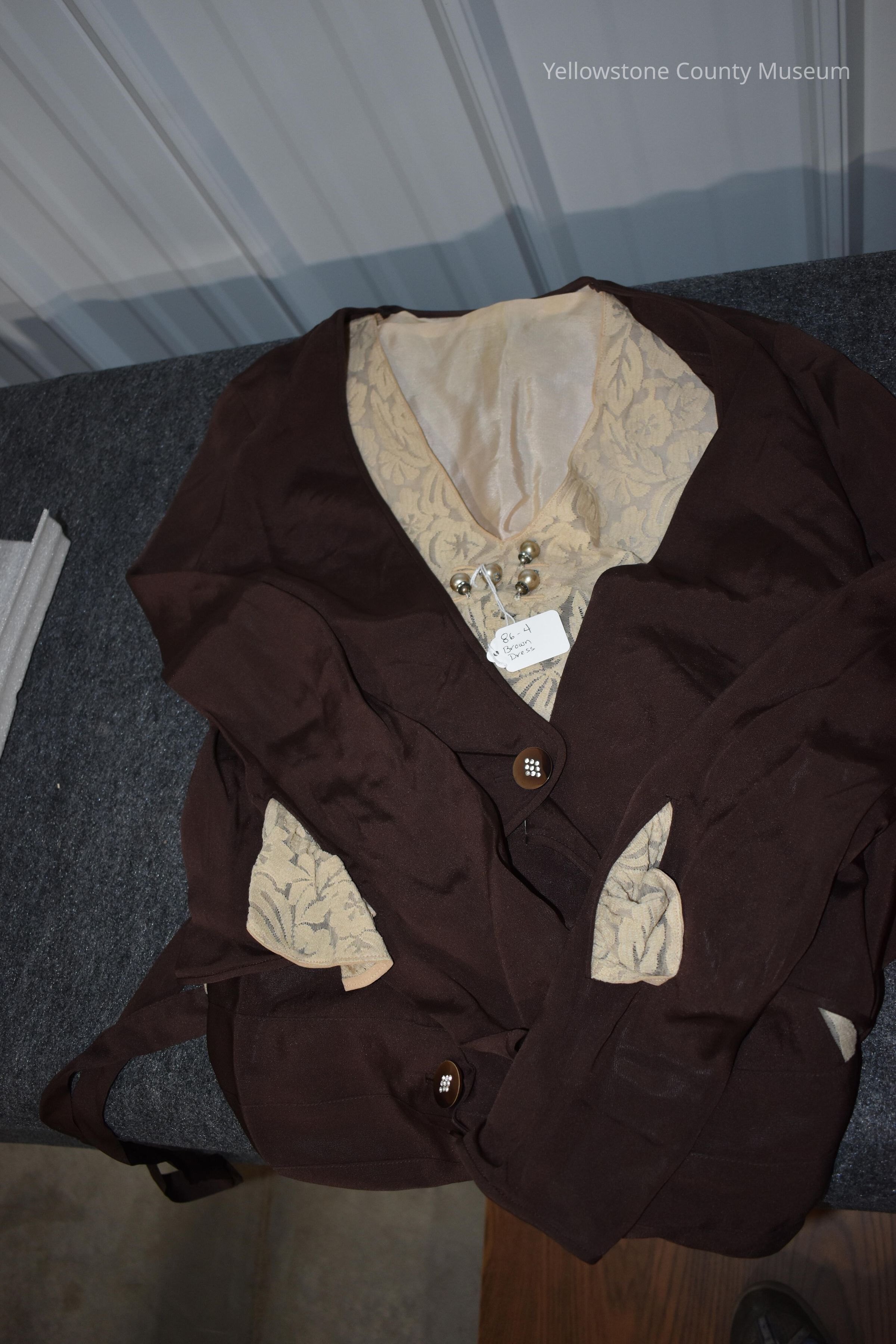 Brown Dress, 1927, embroidered cream-colored bodice with 4 pearl shaped buttons and 3 brown studded buttons on waist.; attached long-sleeved fake jacket and beltAcquisition