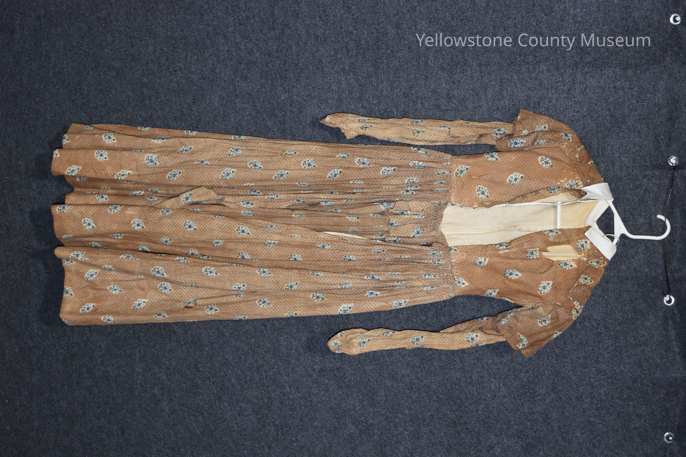 A brown dress with dark brown polka dots and small tan, blue, and brown symbols; the dress has several rips and teas, especially on the sleeves, the wearer's left shoulder, and the back; the dress has a white collar and long sleeves, and is clasped in the front by a series of hooks and loops.Acquisition