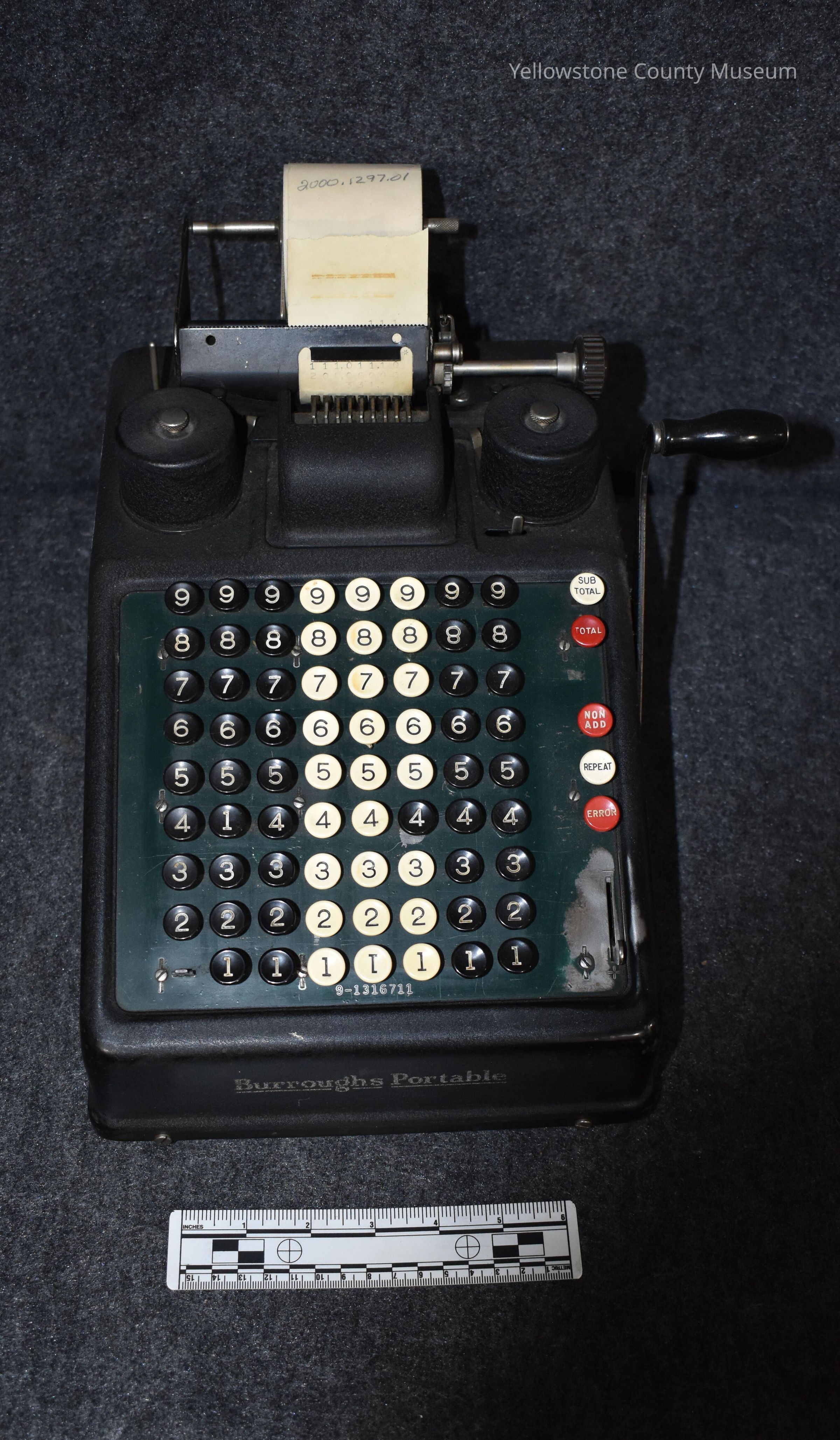 A & I Distributors in Billings, MT. This adding machine was used until the 1940's when it was replaced by an electric calculator. It is still in working condition.Acquisition
