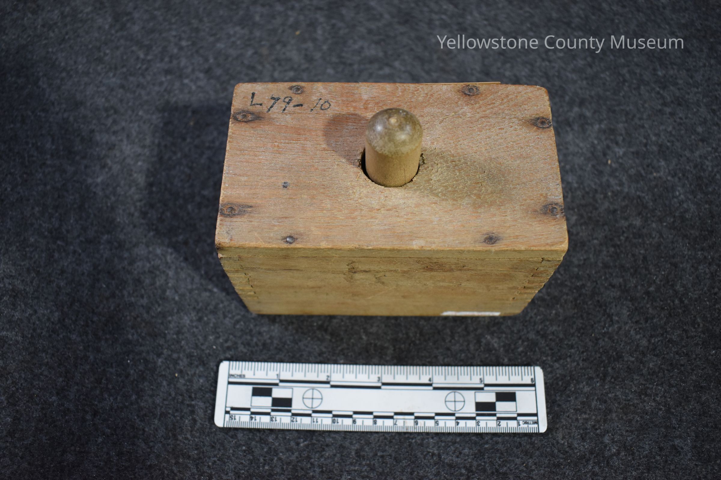 Butter mold and paddle used in the home of Euna P. and Lloyd E. Cook during early years of 1900. Loaded by Lloyd E. Cook."Acquisition