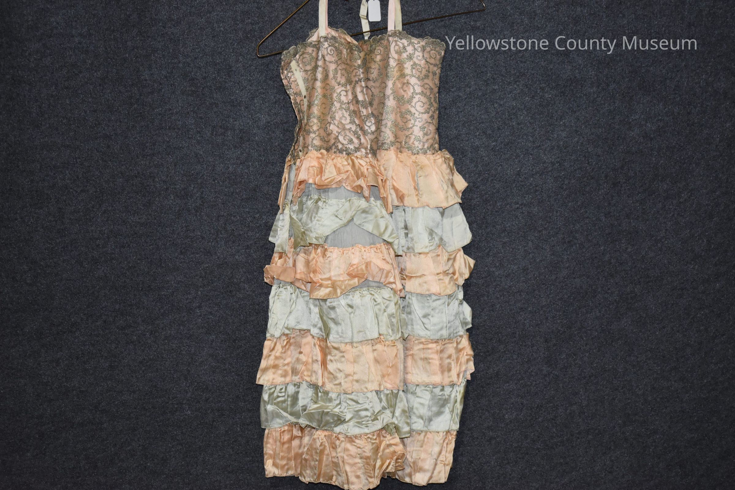 Camisole is lace tope with tiered ruffles in peach and green satin fabric. Pantaloons have ruffles on the legs.Acquisition
