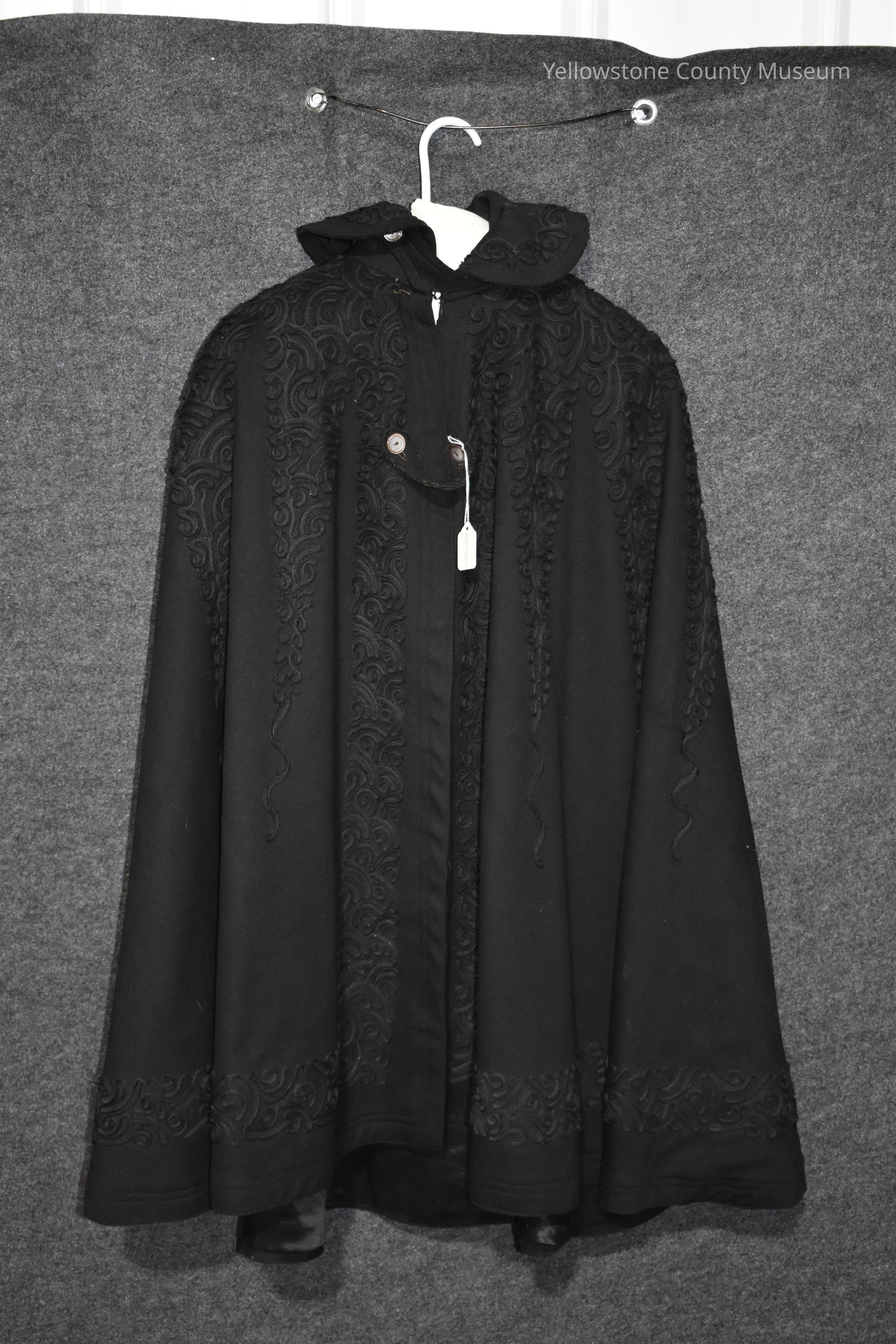 A black women's cape; the cape has a embossed patterns down the front, on the shoulders, and on the collar; there is a metal hook claps at the neck, and two button clasps a bout 7 inches apart; there is a rip inside the collar, that has been repaired with brown thread. ITEM 109Acquisition