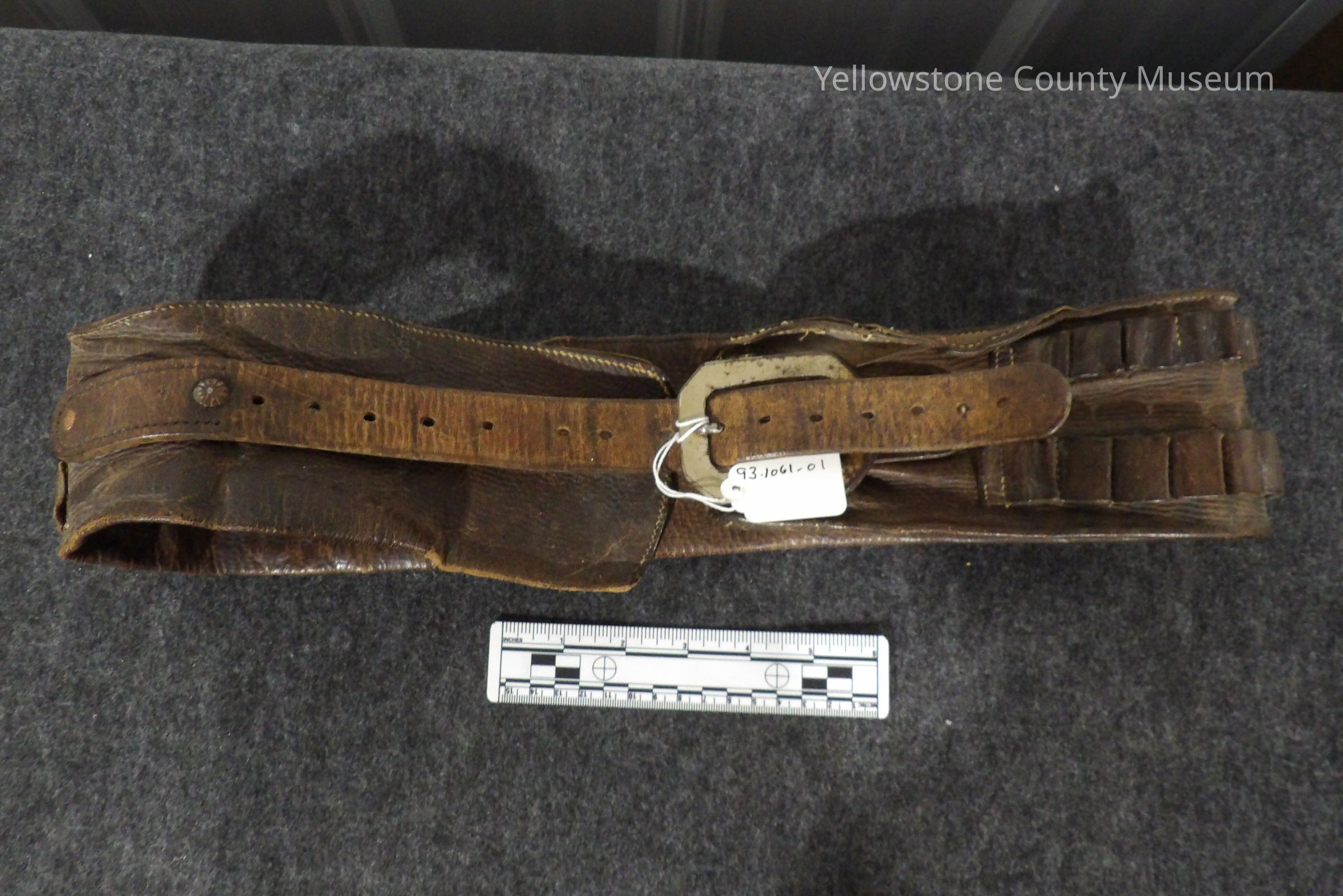 Brown leather cartridge belt with buckle. Belonged to Phil Sidle