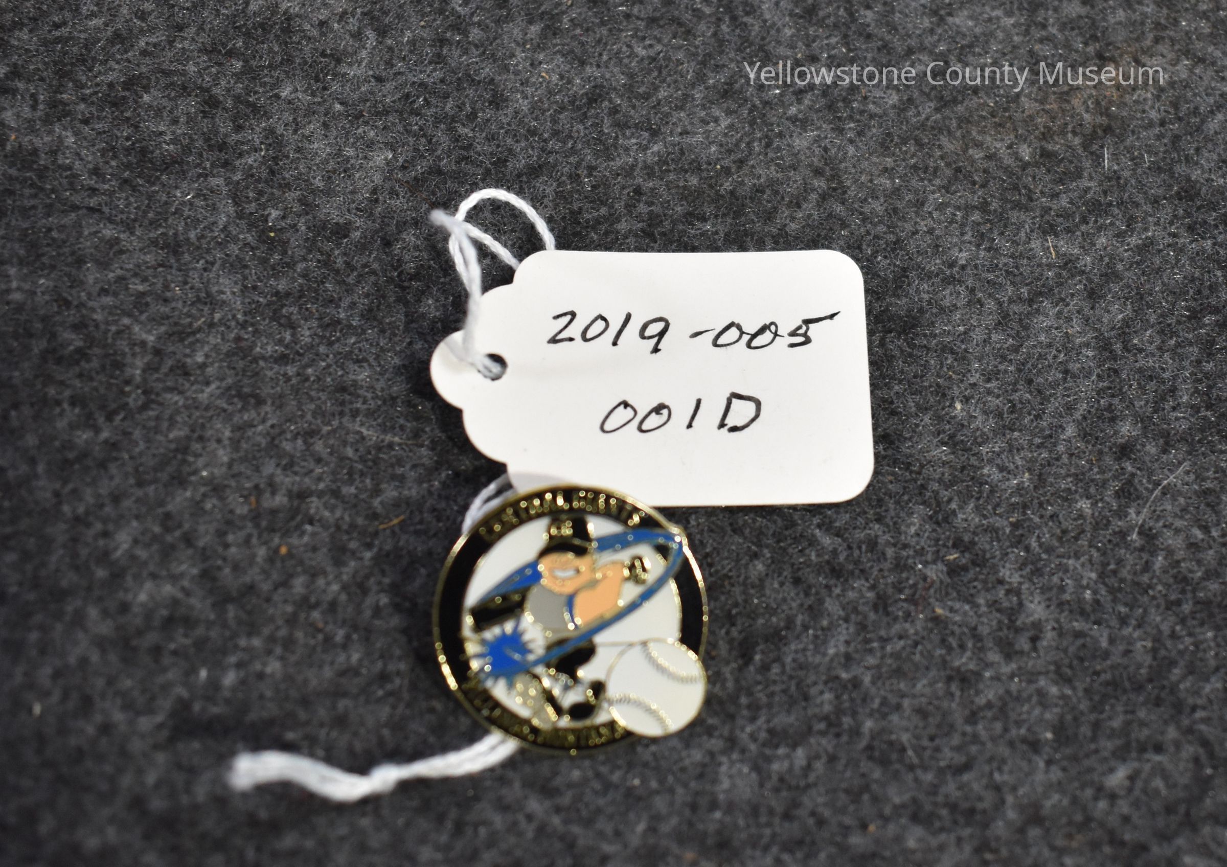 A white round pin with a black border. In the middle is a depiction of a baseball plater holding a bat and hitting a baseball. The pin has silver lettering and reads "Central Giants - Billings, Montana"Acquisition