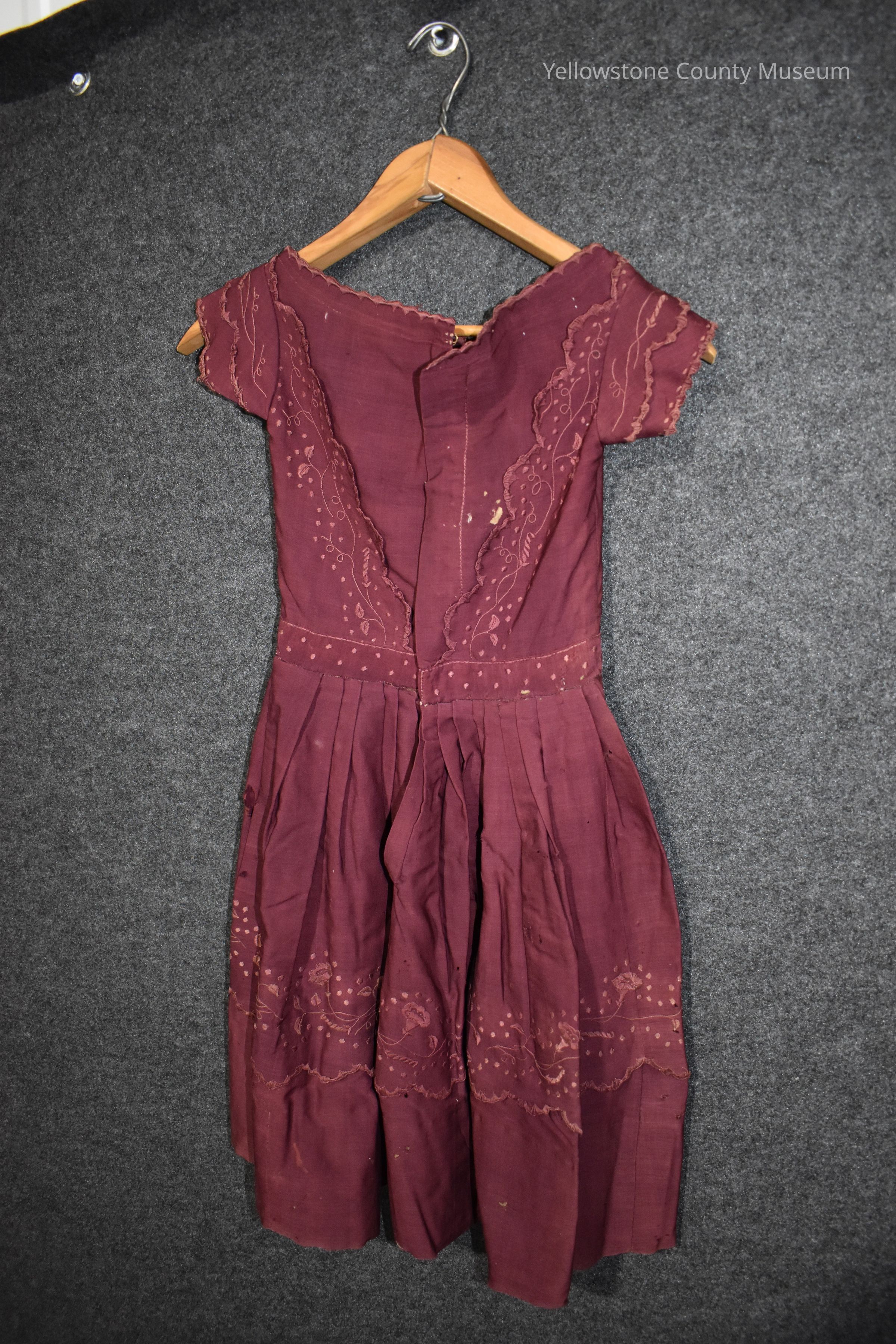 Child's Dress, Burgundy with a lighter burgundy design flowers and leaves, Embroidered with hook and eye fasteners