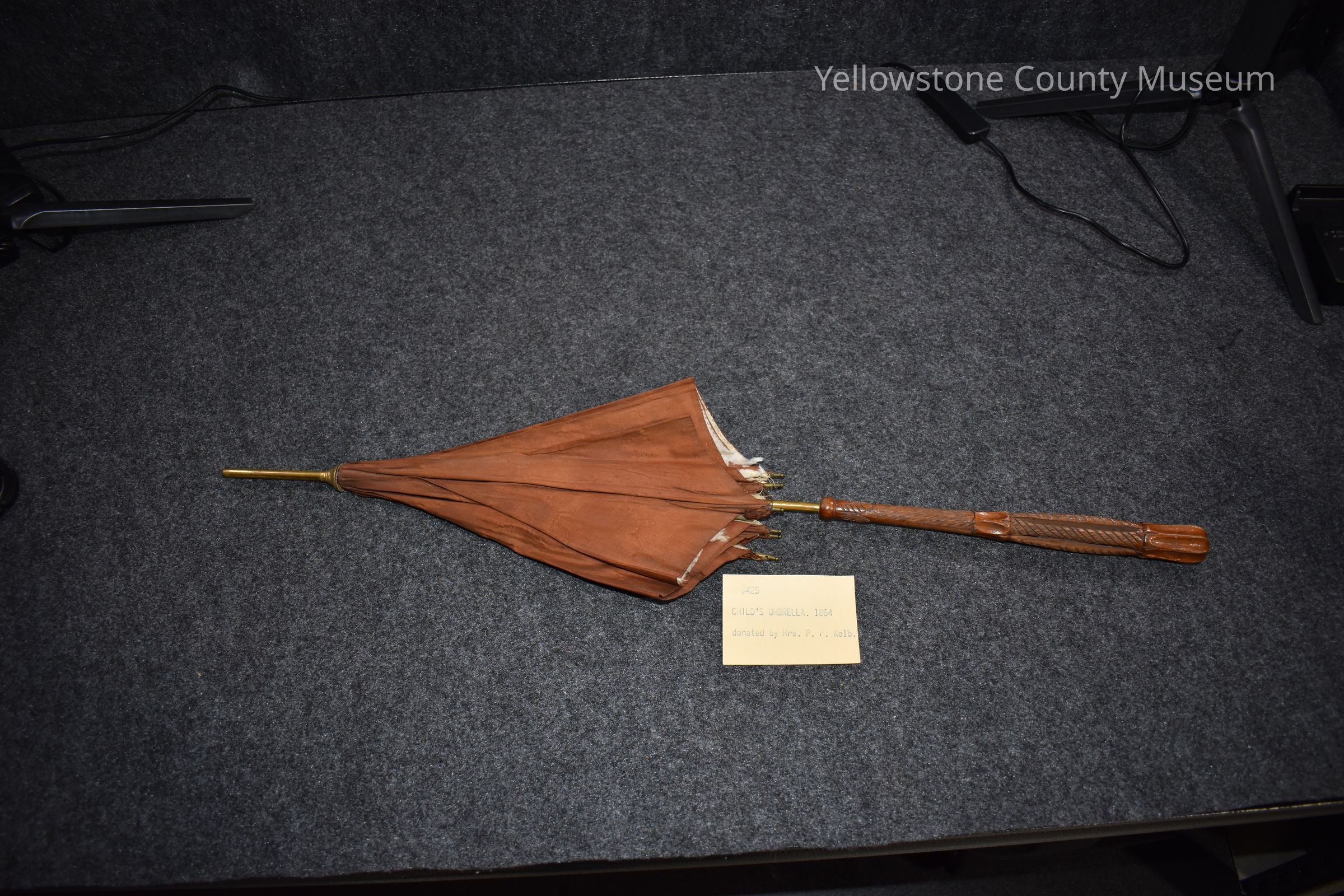 Child's Umbrella Brown, metal shaft, carved wood (oak?) handle, 1864 circa.