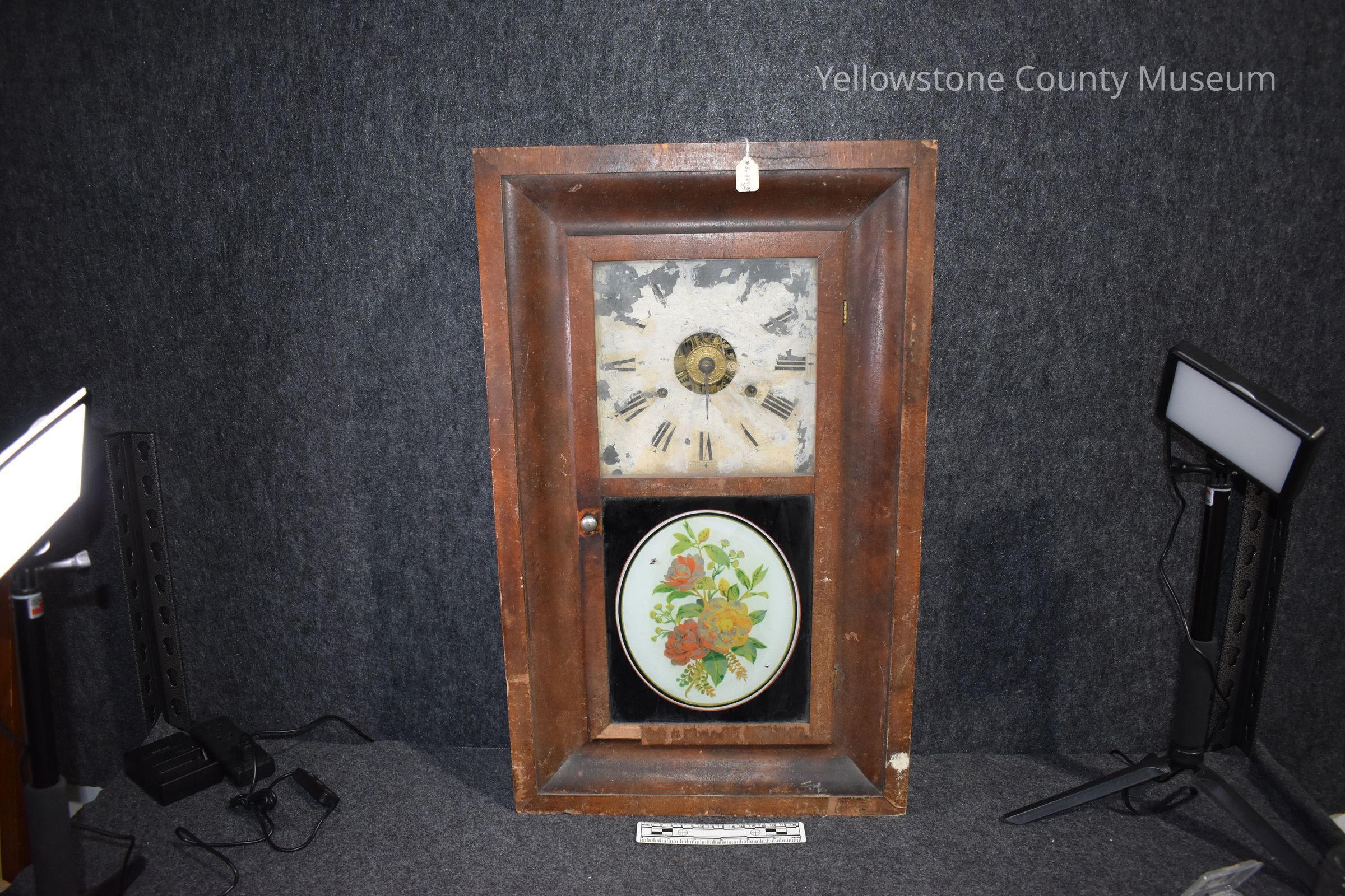 rectangle wooden framed door-pendelum broken square clock face white with black roman numerals and black hnds inside it reads: SETH THOMAS CLOCK, Conn, U.S. A.Acquisition