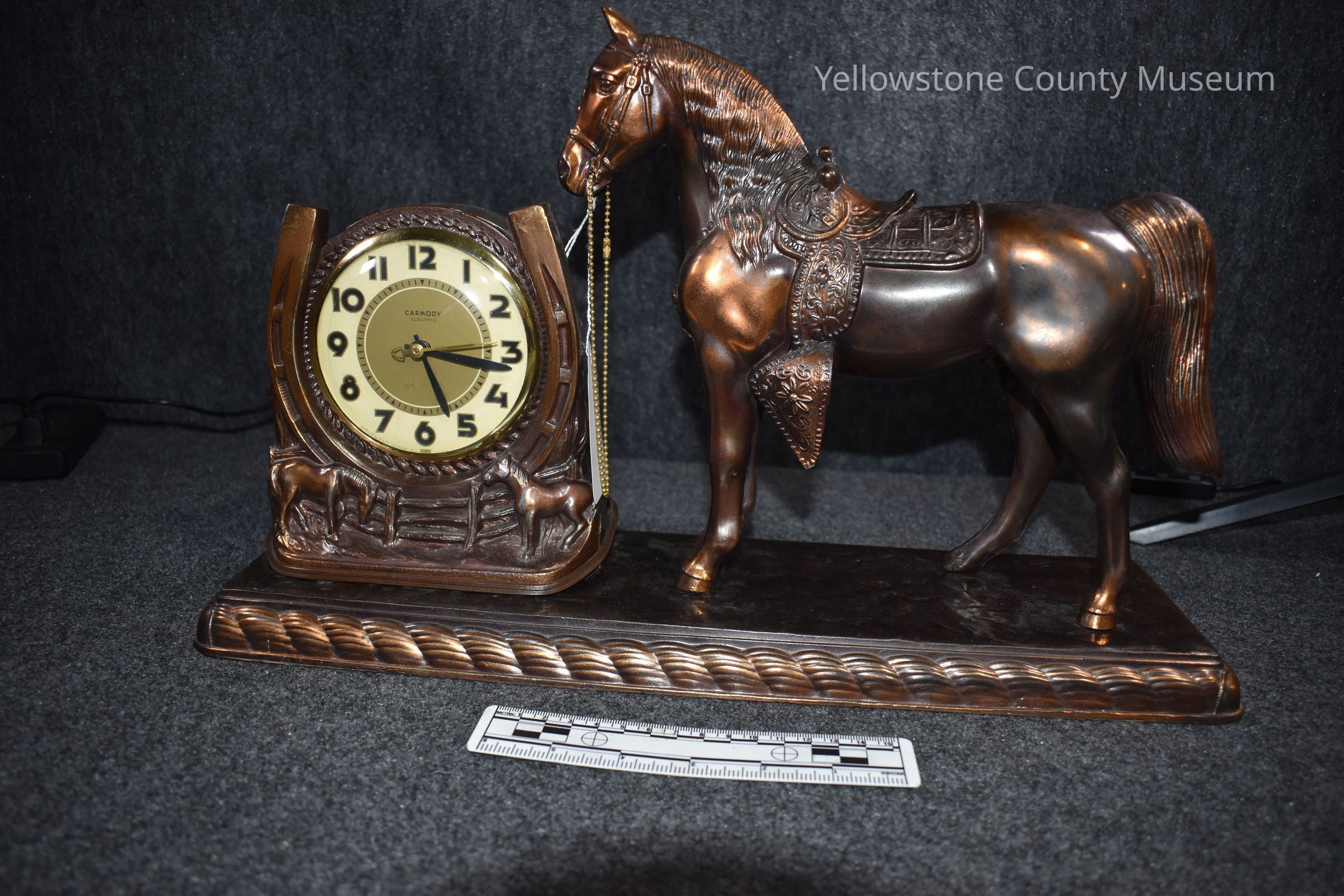 An ornate bronze electric clock; the object is an electric analog clock; the face uses standard numbers and has an hour, minute, and second hand; on the face reads: "Carmody Electric"; the clock is in a horse shoe with the likeness of a horse on either side; to the right of the clock is a large representation of a horse with a saddle; the opposite side has a power chord.