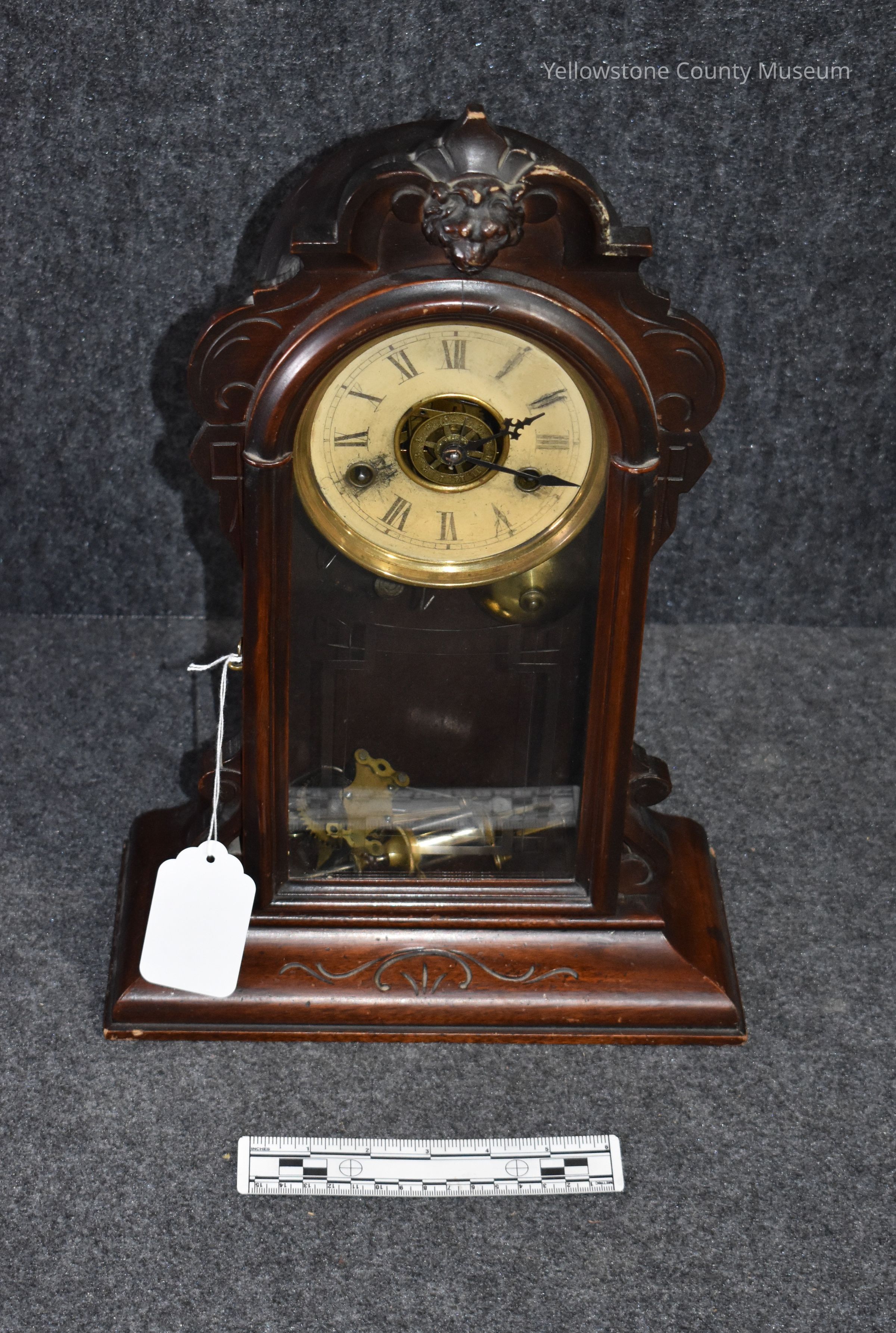 A small, ornate, grandfather-style clock; the clock face is cream colored with roman numerals; the hour hand has a maltese cross symbol while the minute hand is shaped like a spade; clock has a wide wooden base and the likeness of a lion head over the face; the front of the clock is made of glass; inside are the components for the pendulum.Acquisition