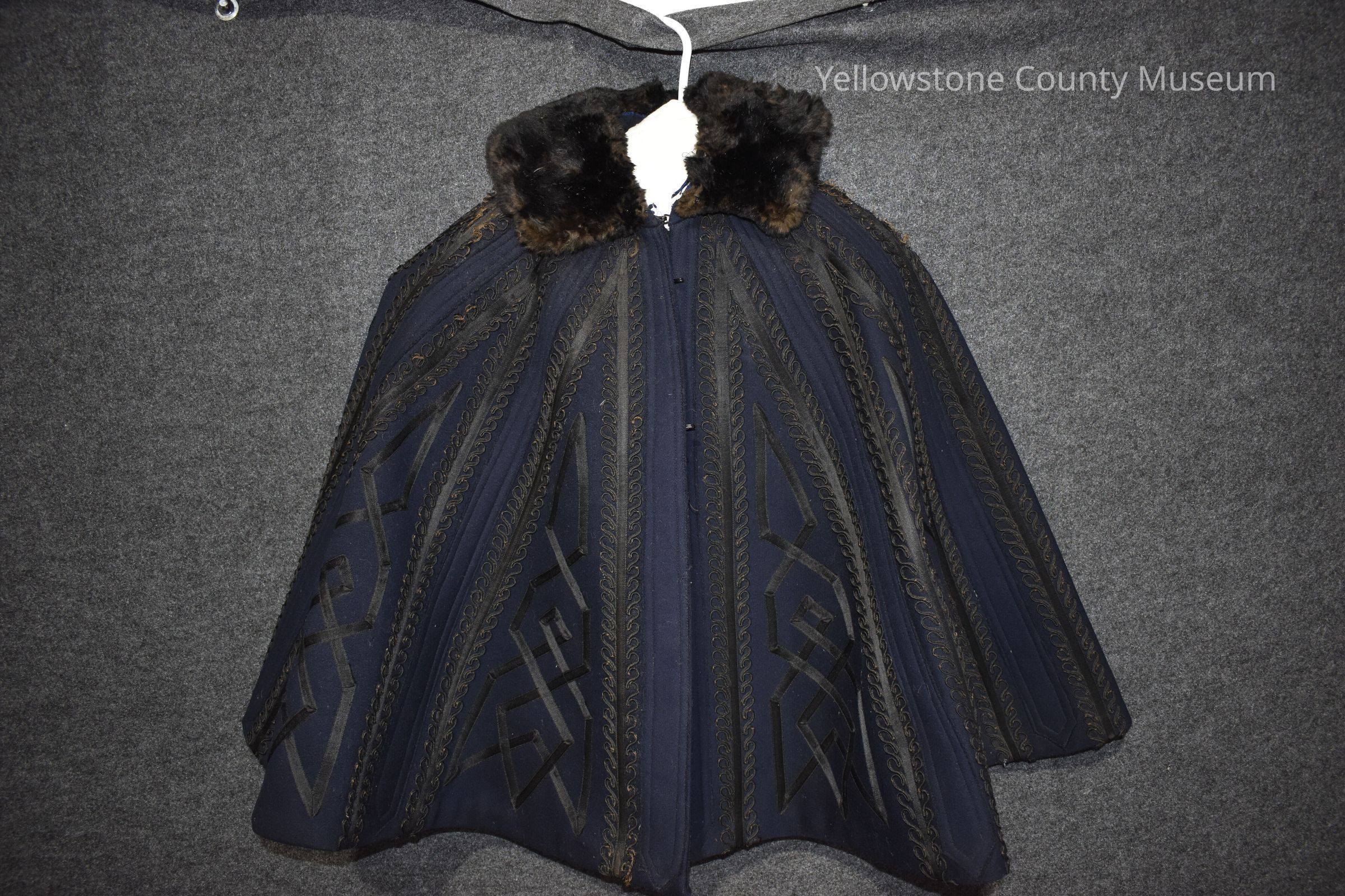 Cape, Dark Navy-blue with black embroidery design and brown fur collar, navy blue liner, and 5 hooks and eyes. Neck label reads: R.J. Brigland Mantles and Costumes. Torn at left shoulder.Acquisition