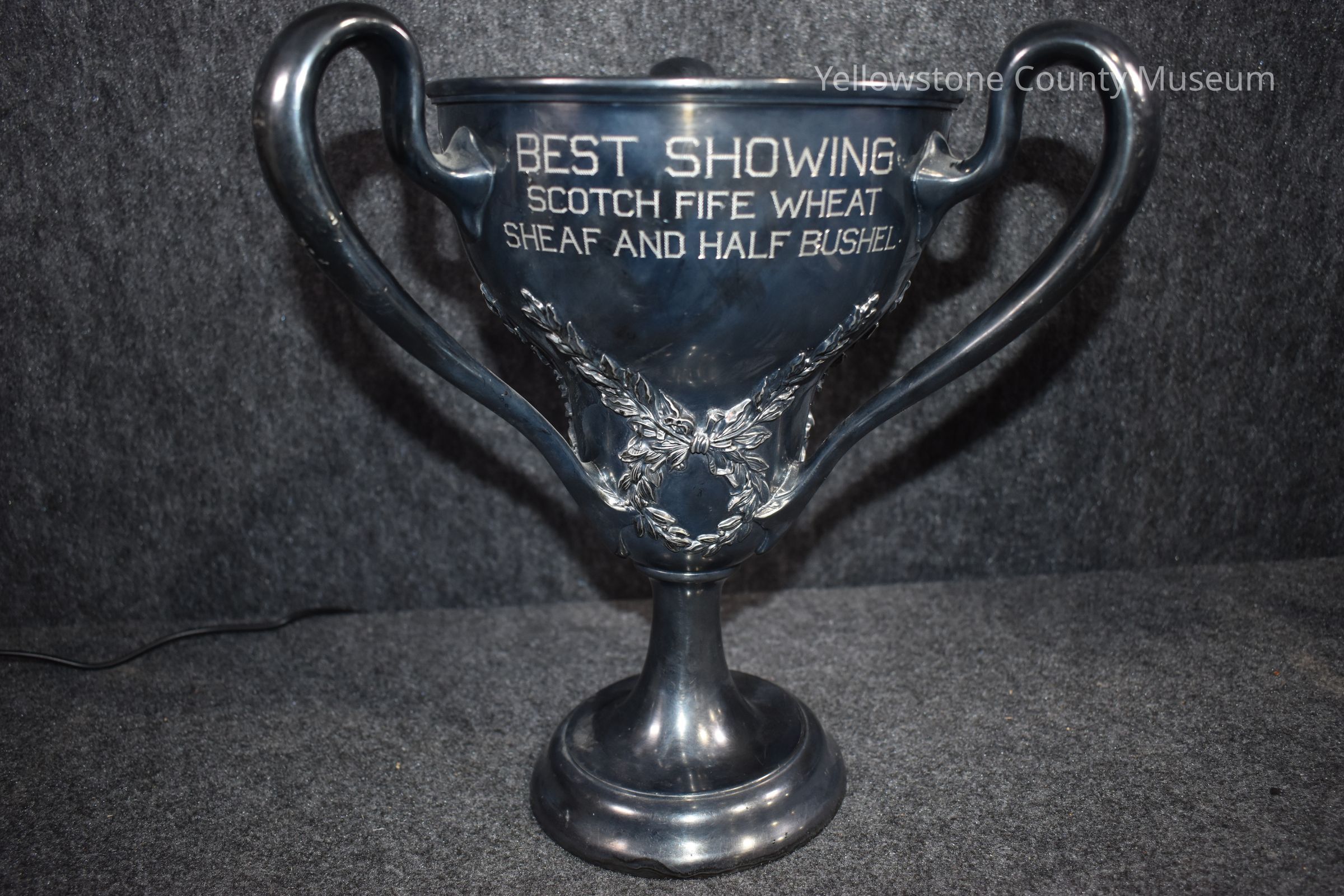 One side is engraved with "Best Showing Scotch Fife Wheat Sheaf and Half Bushel"; 2nd side is engraved "Dry Farming Congress, Billings Montana, October 26-27-28 1909"; 3rd side is engraved "Presented by Reeves & Company,