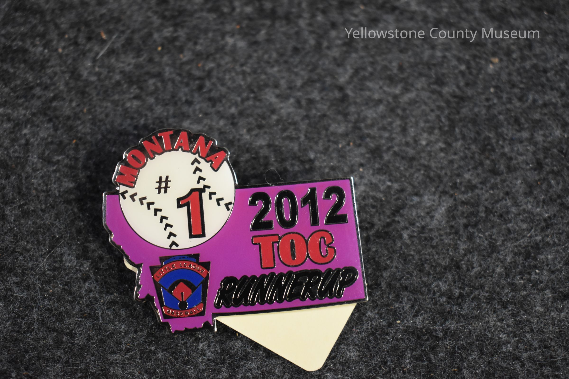 A purple montana shaped pin with a baseball in the upper lefthand corner. The baseball says "Montana 1" and the state portion of the pin says "2012 TOC Runnerup." In the lower lefthand corner is the Little League Baseball logo.Acquisition