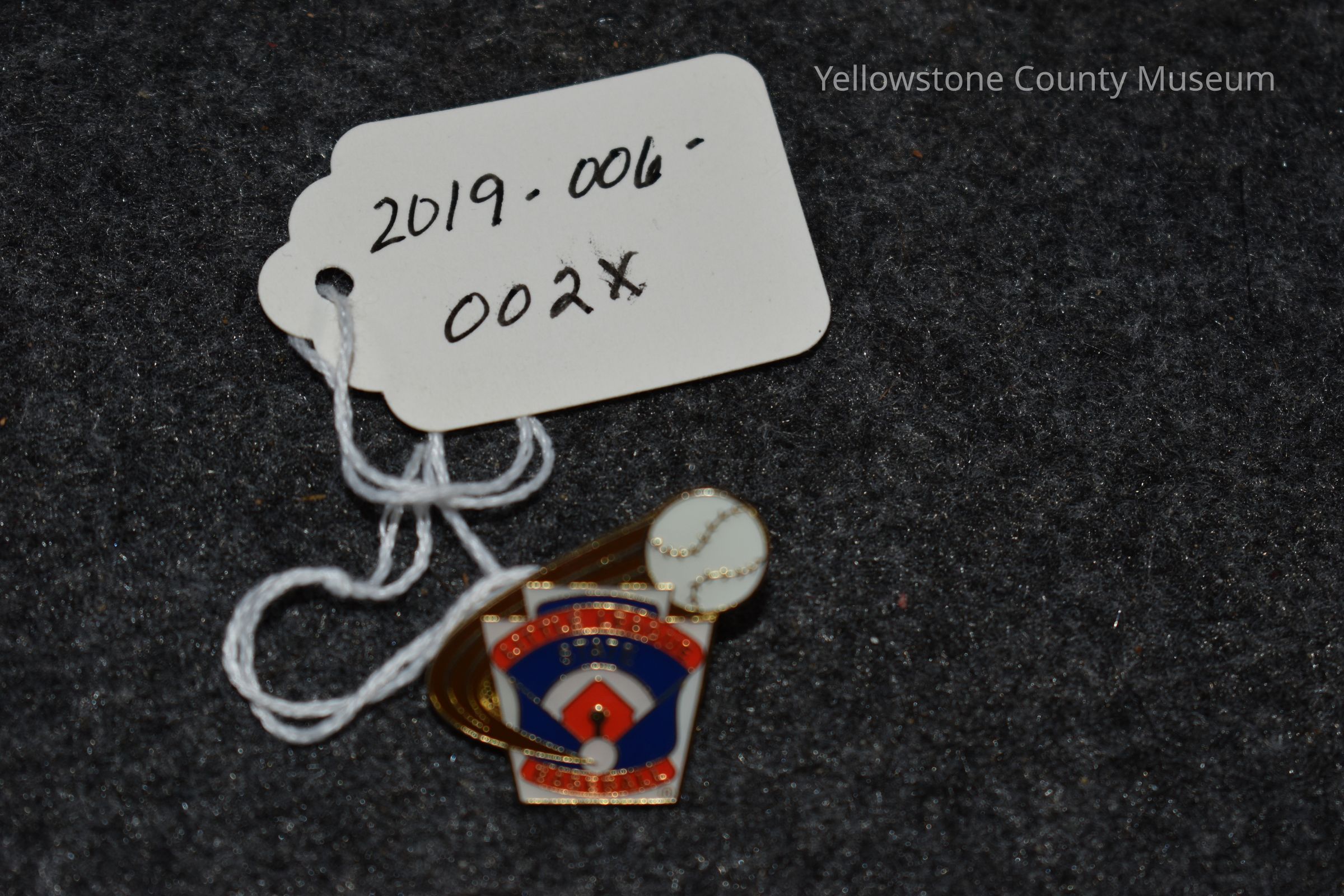 A red,white, and blue pin shaped like the Little League Baseball logo. The pin has a white baseball in the upper right corner.Acquisition