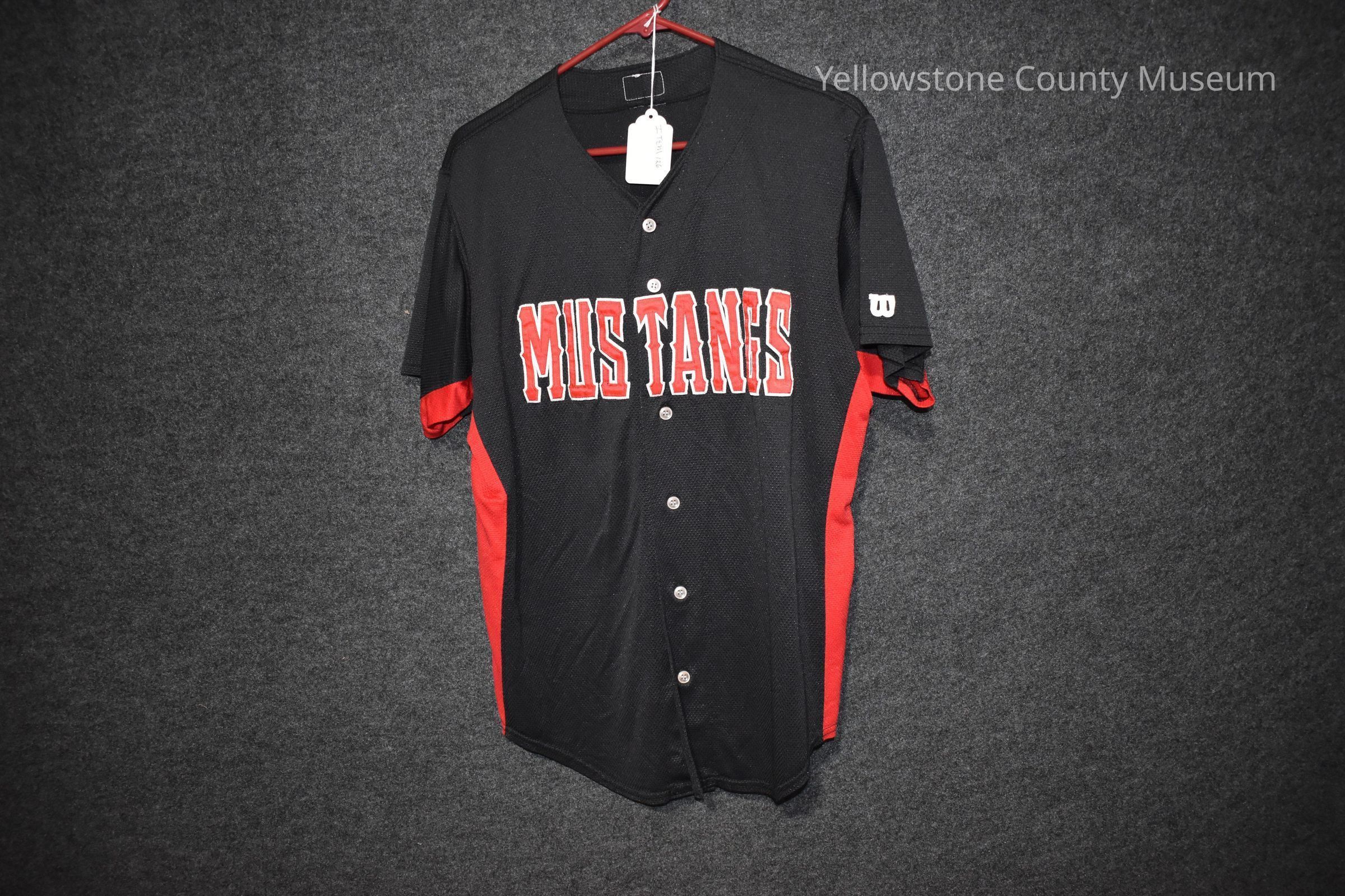 A black Billings Mustangs jersey with red and white letterings and red stripes down either side. On the front chest area reads MUSTANGS. The number on the back is 5. ITEM 126Acquisition