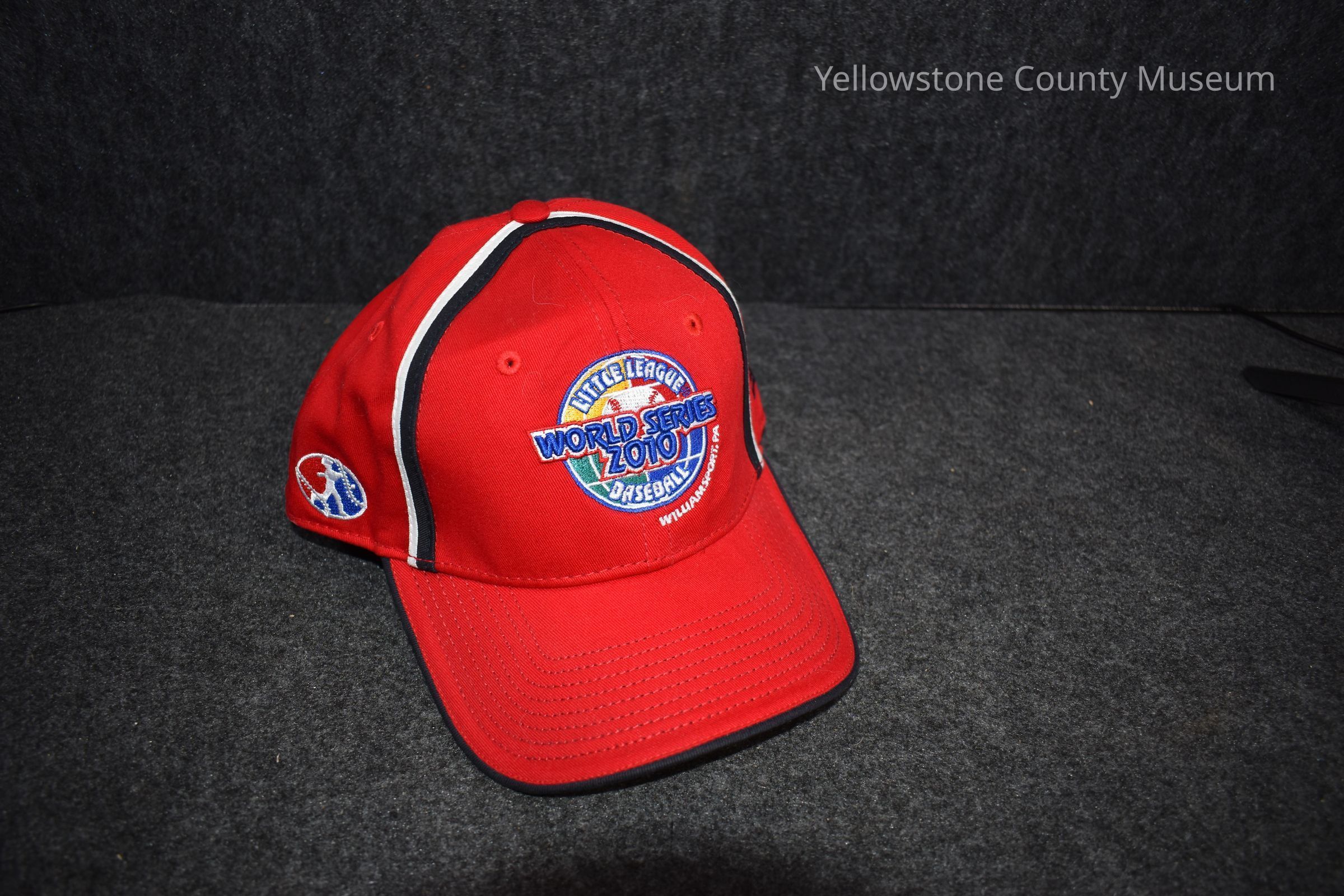 A red, black, and white, baseball cap with 3 logos. 1st logo: on the front is a logo the reads: "Little League World Serieis 2010 Baseball,Williamsport, PA." The second logo on hte left side is the manufacturer's New Era logo. The thirds logo on the right side is some little league organization logo in red, white, and blue.Acquisition