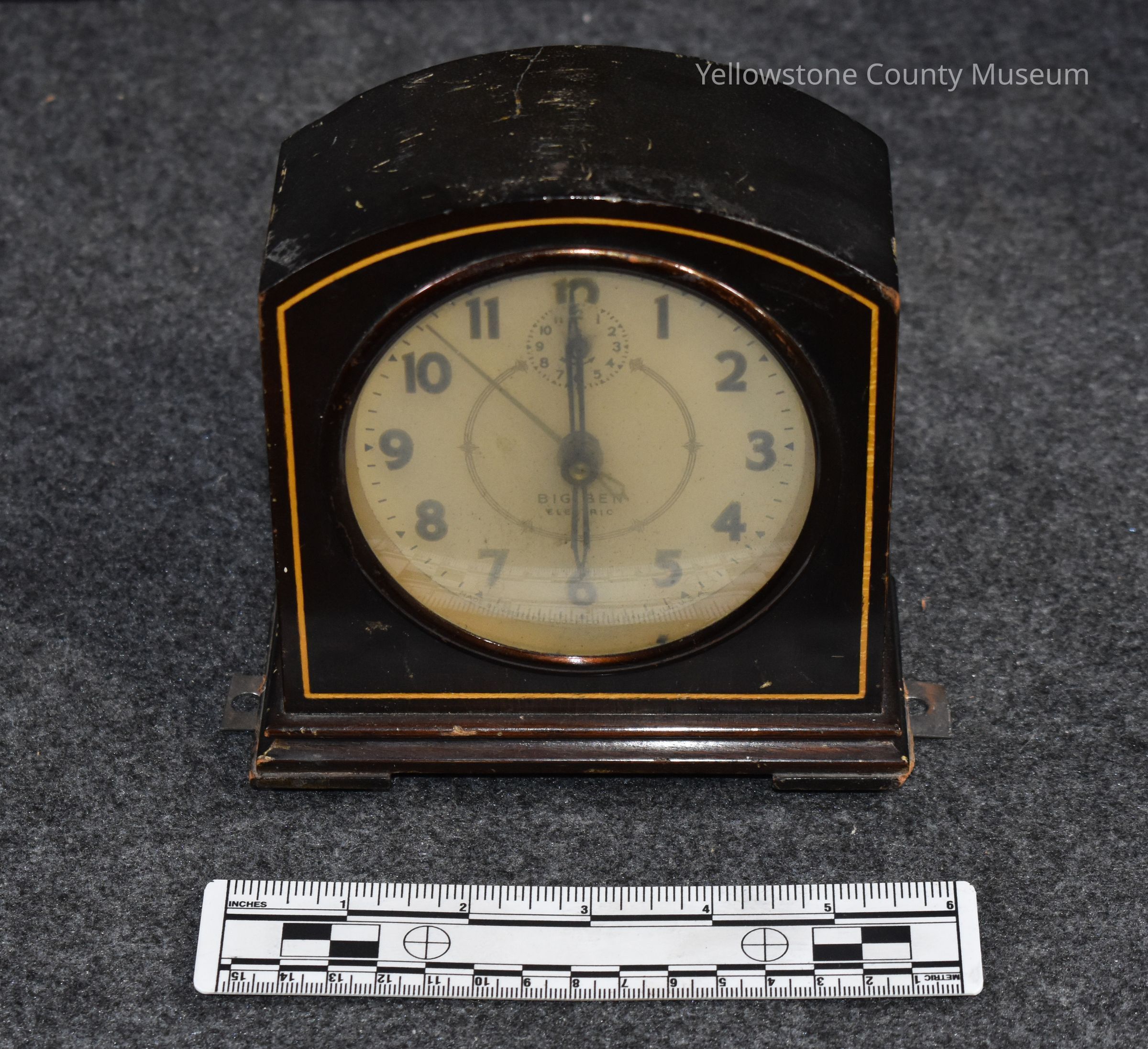 An electric clock; the clock is an analog clock with hour, minute, and second hands; near the center of the clock reads: "Big Ben Electric"; at the bottom edge of the face reads: "Made by Western Clock Co. La Salle, Ill., U.S.A."; clock has a wooden case with a yellow/gold inlay around the front edge; on the back side is a power chord, and several knobs and buttons for setting the clock hands and setting the alarm function; there is also a small information plate that reads: