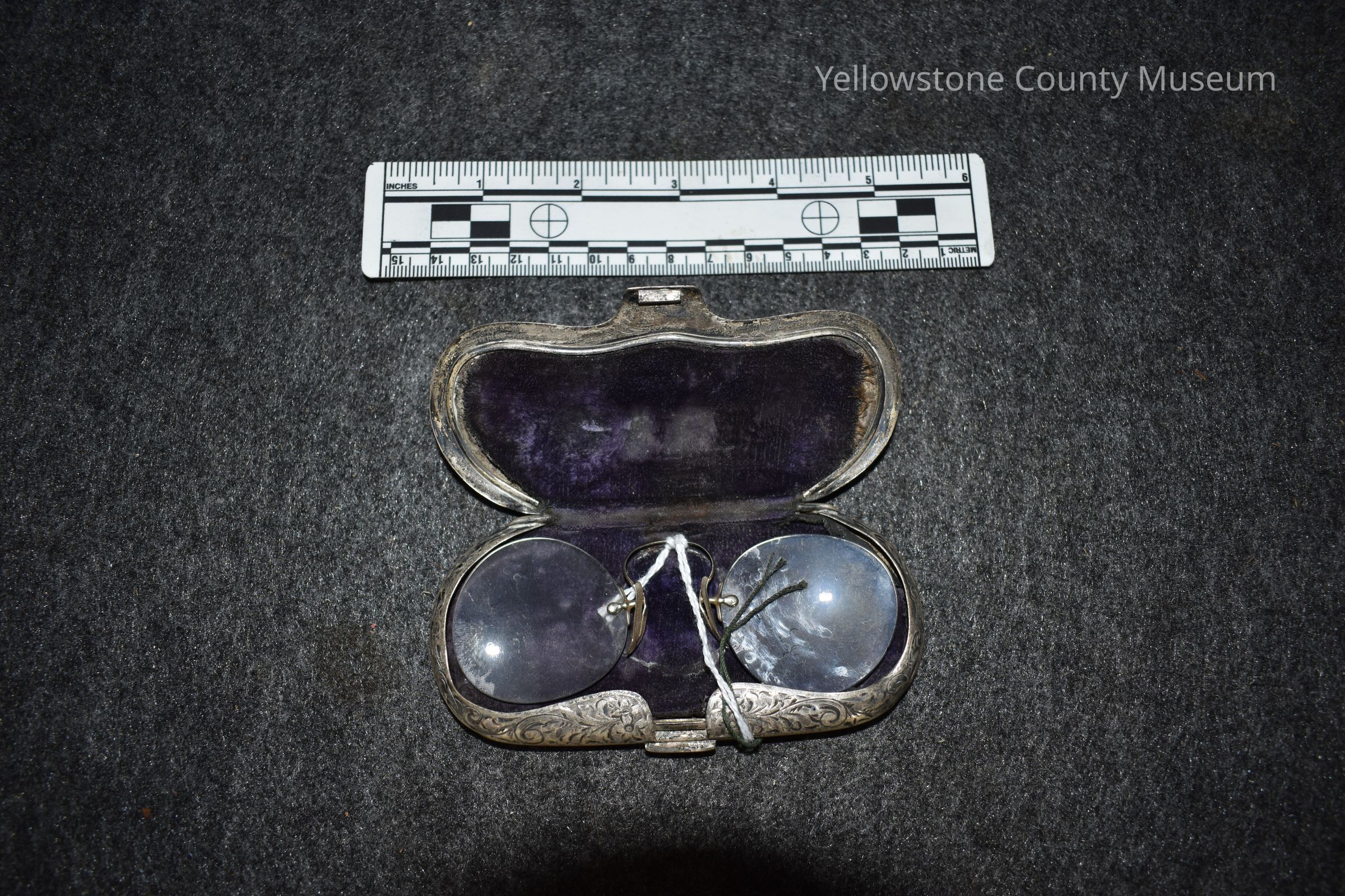 Eyeglasses and silver colored ornate metal case, DGD stamped on topAcquisition