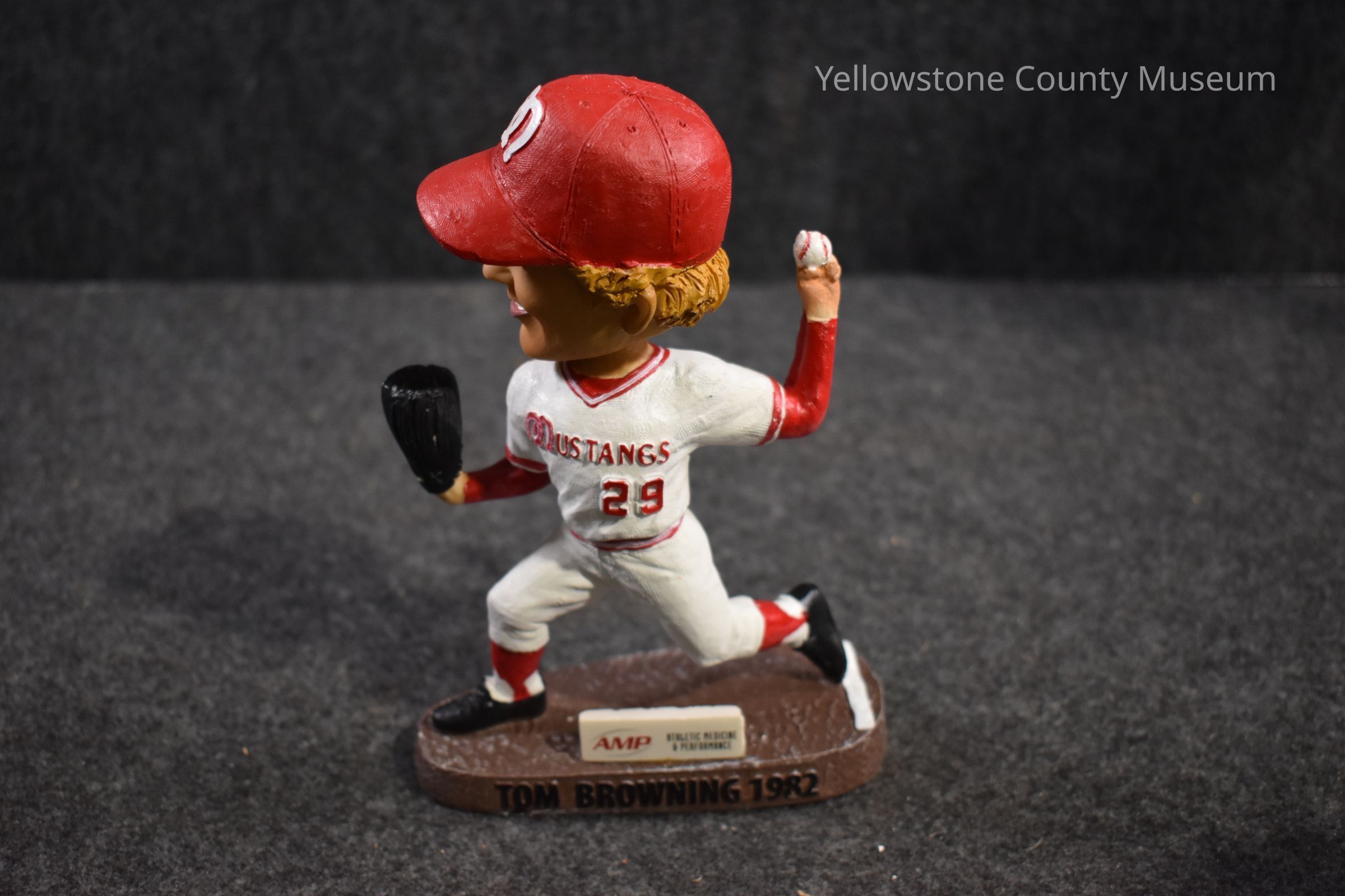 Tom Browning. A man wearing a white jersey and a red hat with 'BROWNING 29' clearly written in red. The base of the bobblehead reads 'Tom Browning 1982'.