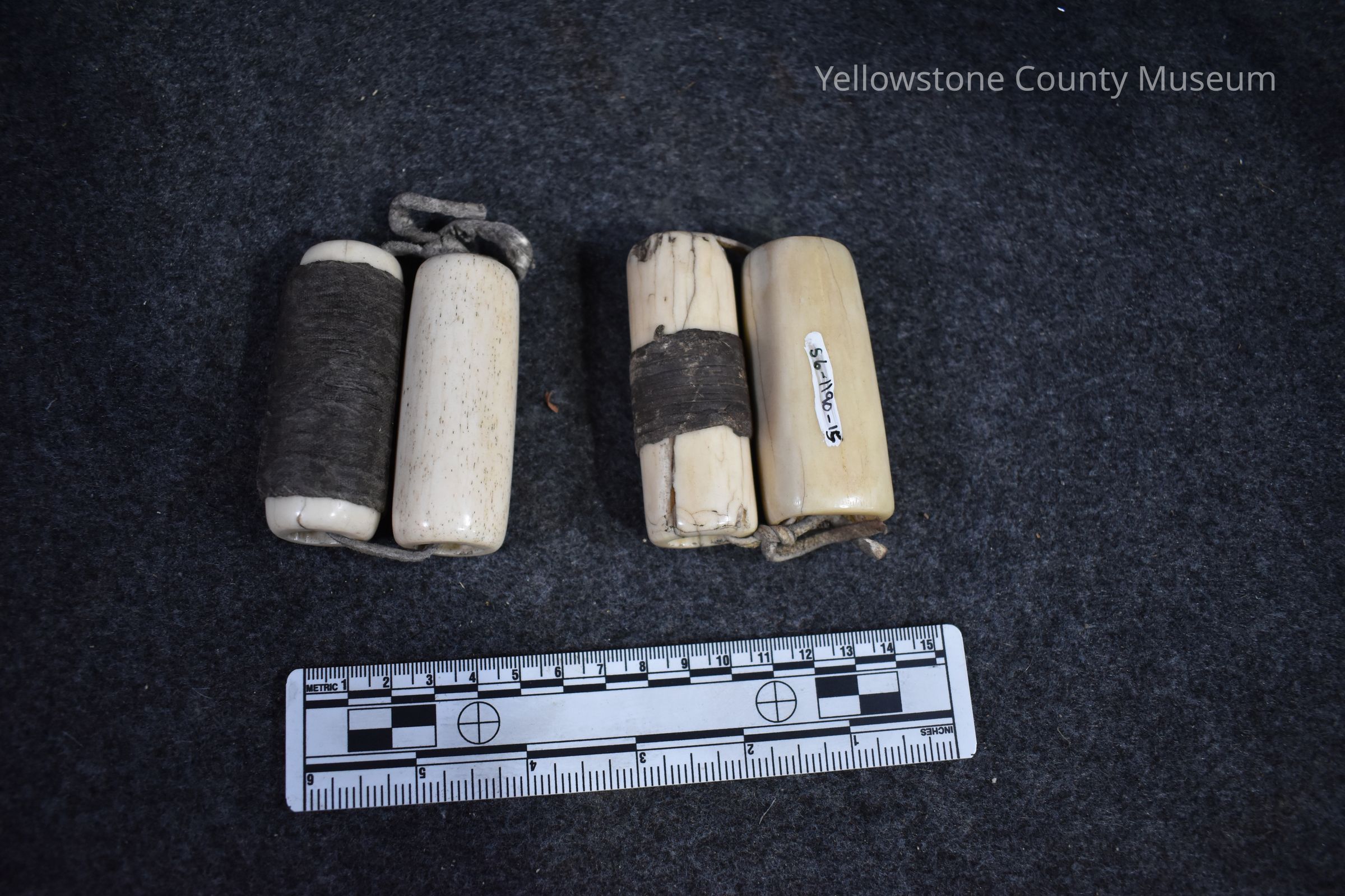 (#16) Gambling Bones (Native American Game); 2 pair wide bones on leather thong, 2 are taped (bone has split)Acquisition