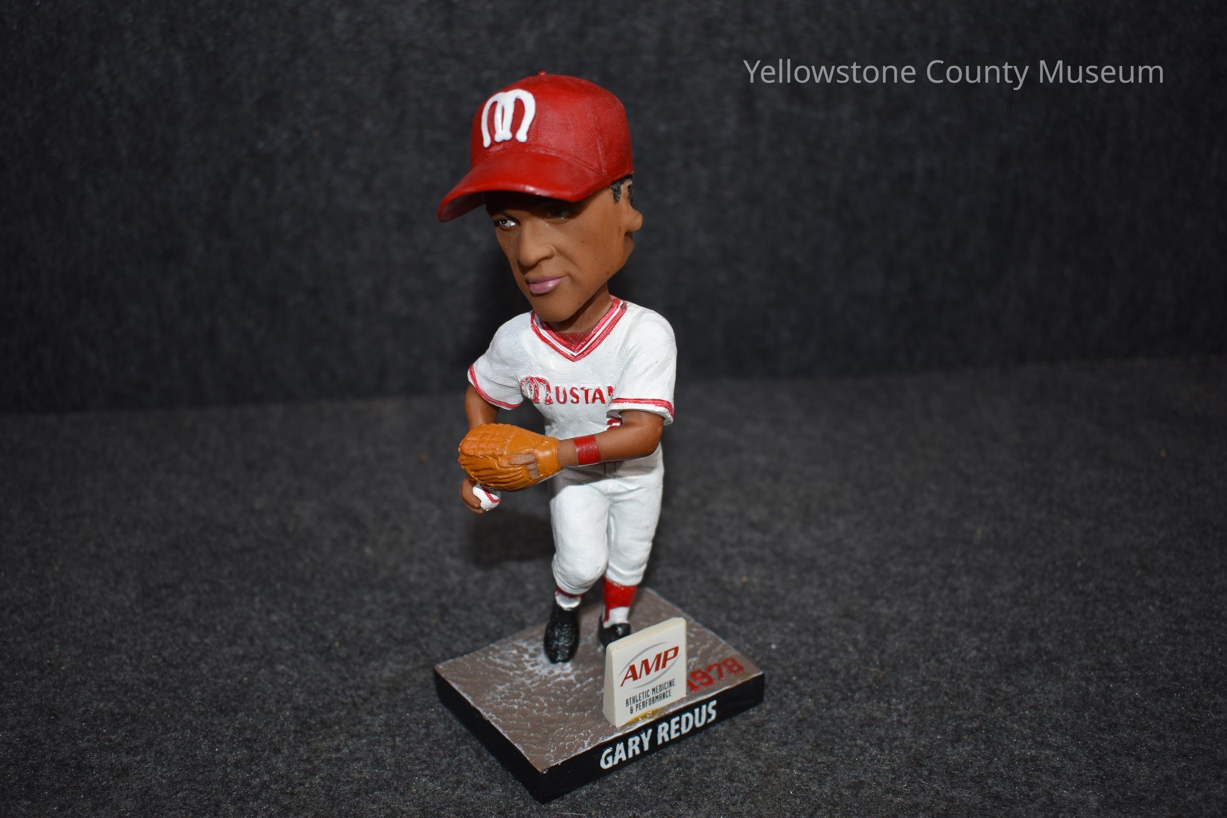 Bobblehead figuring featuring the likeness of Gary Redus. Figurine is in Billings Mustangs uniform with the number "2" and the name "Redus" across the back, has Mustangs cap, baseball mitt, and baseball. On the base is the logo for the sponsor Athletic Medicine & Performance and reads "GARY REDUS 1978"