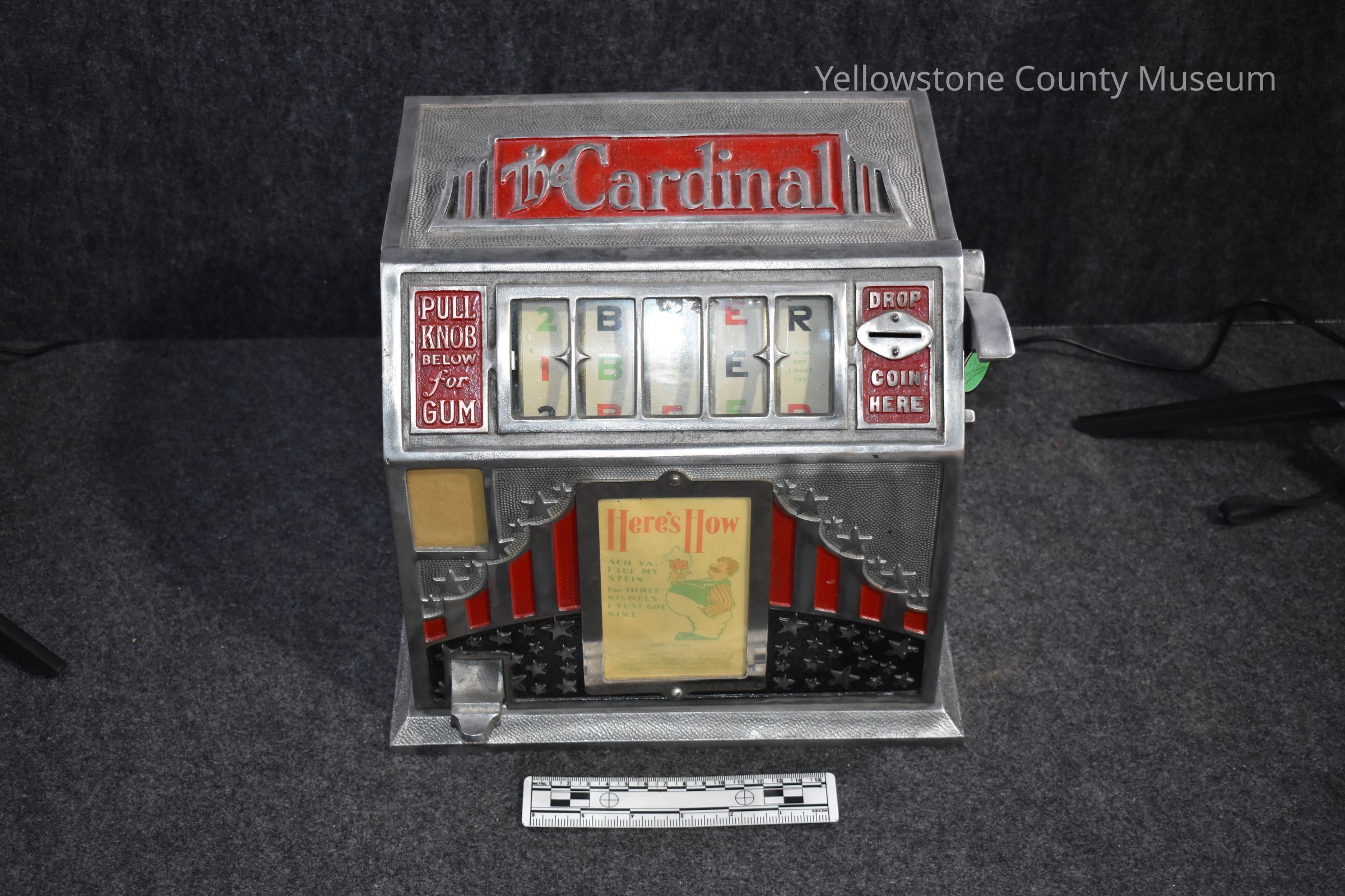 Slot Machine; - not in working order Slot machine made of nickel with red and black " Stars and Stripes" design. Also silver plate frame holding laminated picture describing how to use machineAcquisition