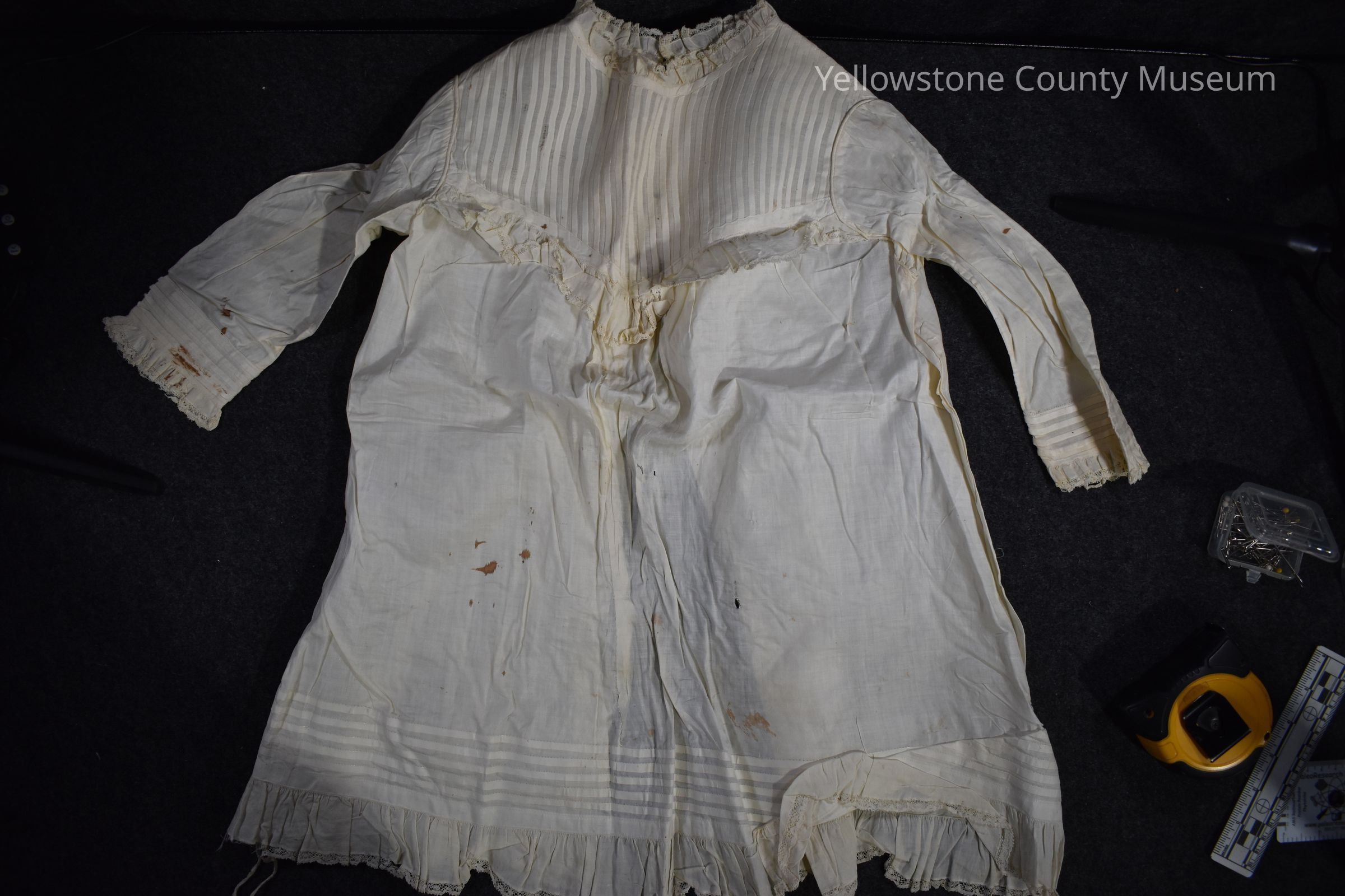 Pleated yoke, ruffle, lace at neck & long sleeves. Small holes and stains, buttons missing.