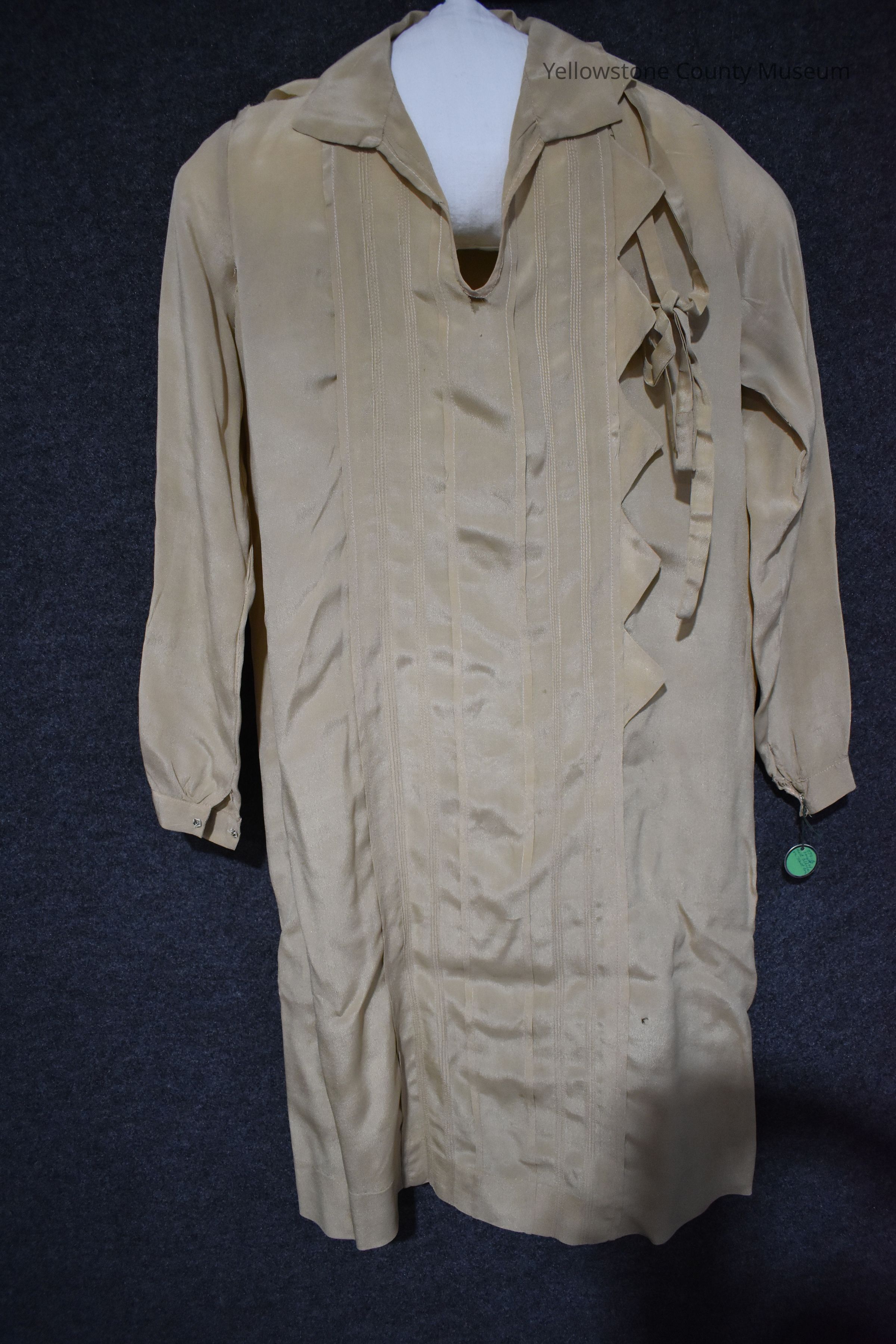 Tan Silk Dress bought in original Hart-Albin Store in Billings on Montana Avenue in 1917, by Ida Savarsey (donor).Acquisition