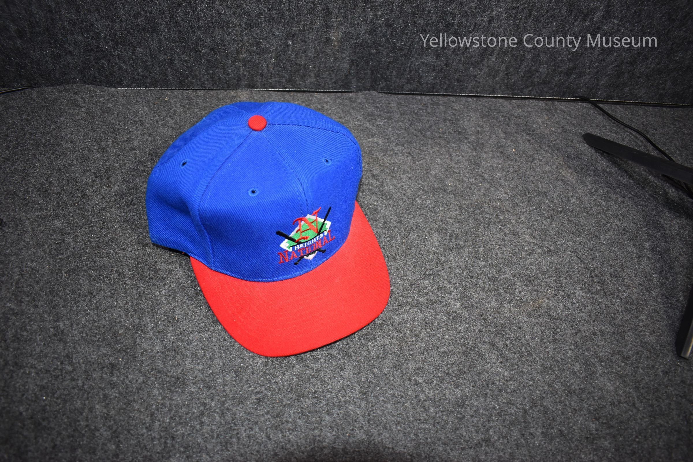 A blue cap with a red bill. On the front is the Heights National Logo, a baseball diamondand two crossed bats with a red "N." The underside of the bill is green. Brand is Otto Cap, made in Thailand.Acquisition