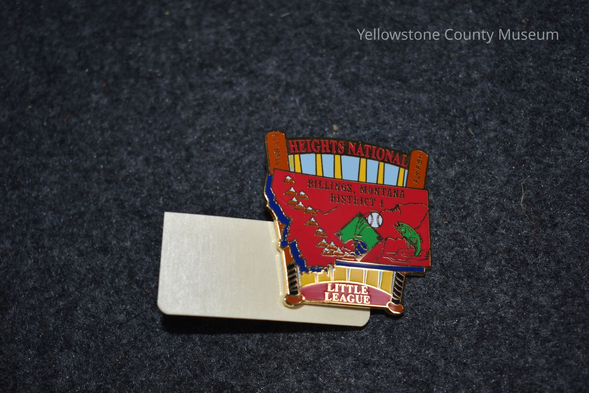 A pin with the shape of the state of montana between two baseball bats. Montana is both red and blue and there is a green baseball diamond in the middle and a green surfacing fish on the right side. The pin reads: "Fly Fish, Fly Ball. Heights National Billings, Montana District 1 Little League."Acquisition