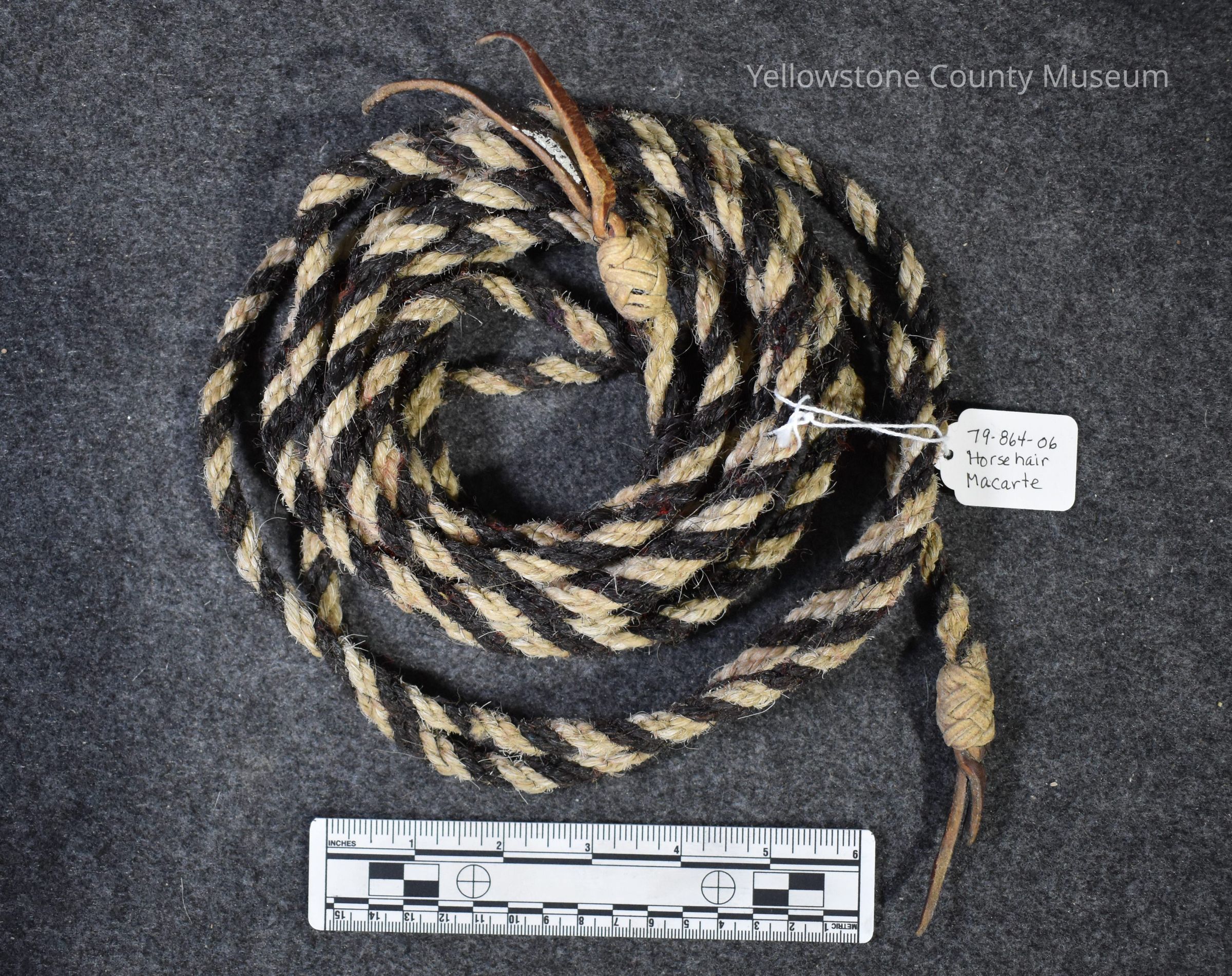 (864-6) Horsehair Macarte (mecate Sp.) Combined lead rope and reins used on a hackamore. Fashioned from horsehair by Elbert H. Davison