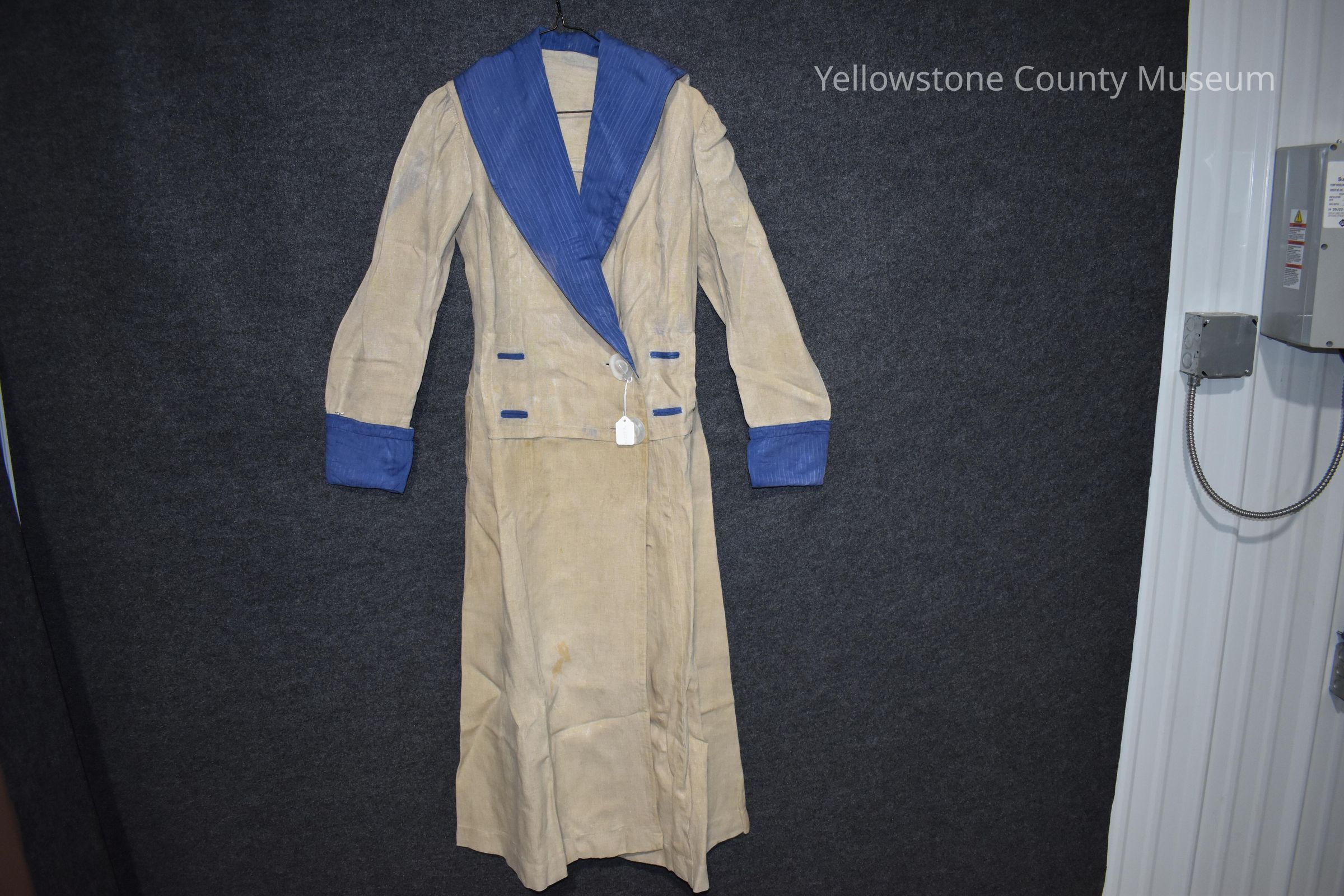 Khaki Coat, full length linen with blue collar, button holes and cuffs, 2 large 1 1/2" white buttonsAcquisition