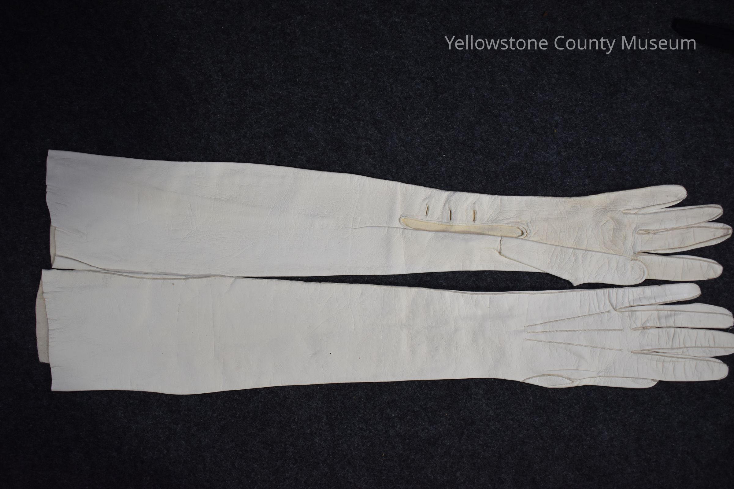 White ladies Kid Gloves (pr), white buttons and button holes, labeled: manufactured in France inside one glove, 6 3/4 in the otherAcquisition