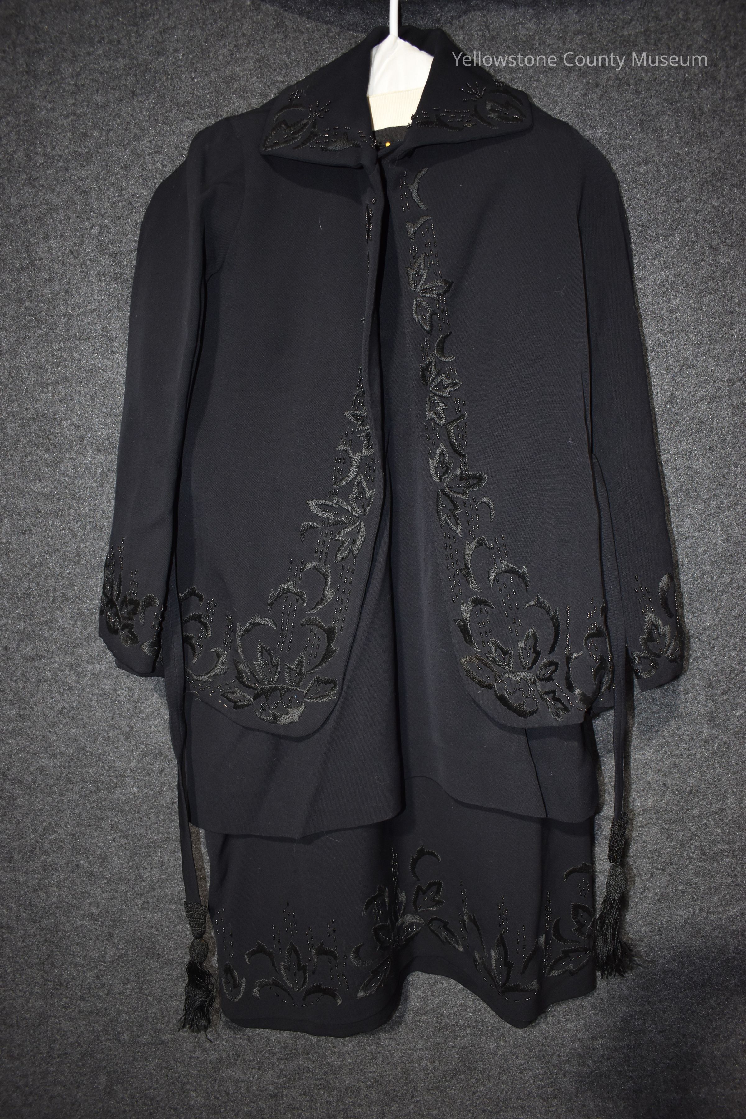 Lady's Black Wedding Suit; Skirt and long-sleeved jacket; both are Beaded & Embroidered as trim. Skirt is 2-layers and the jacket includes a button at the neck & an attached tie belt; 1921 circa.