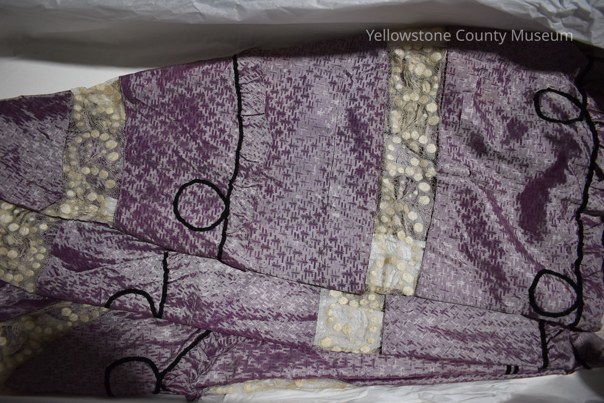 Silk, orchid skirt; tan lace inserts; silk waist band removed; In poor shape due to cuts and tears.
