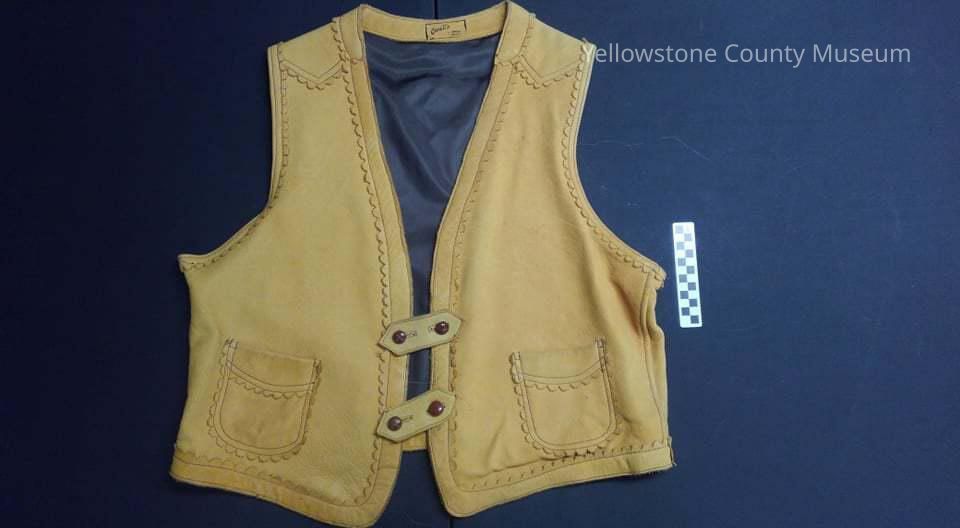 A tan leather vest with a brown satin liner. The vest has two pockets on the front, 4 brown hard-leather buttons (each pair is connected by an extended hexagon leather strip), and on the collar area has a black stamp that reads: "Caroll's. Billings, Montana"Acquisition